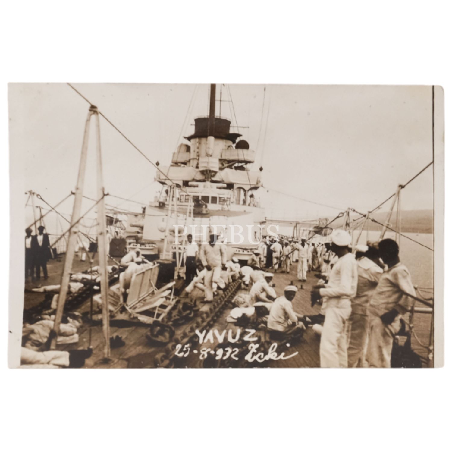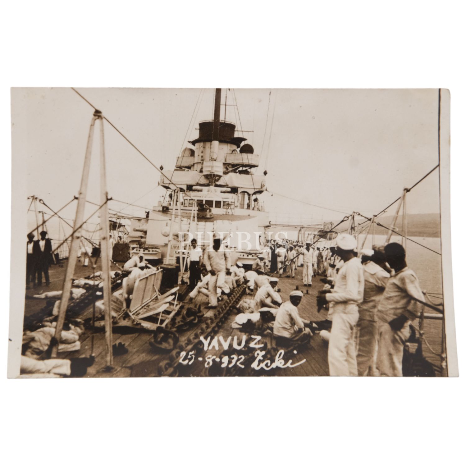 Yavuz Zırhlısı ve mürettebatının, 1932 senesinde 30 Ağustos Zafer Bayramı hazırlıklarında çekilmiş 4 adet fotoğrafı, 25 Ağustos 1932, Foto: Zeki, 9x6 cm...