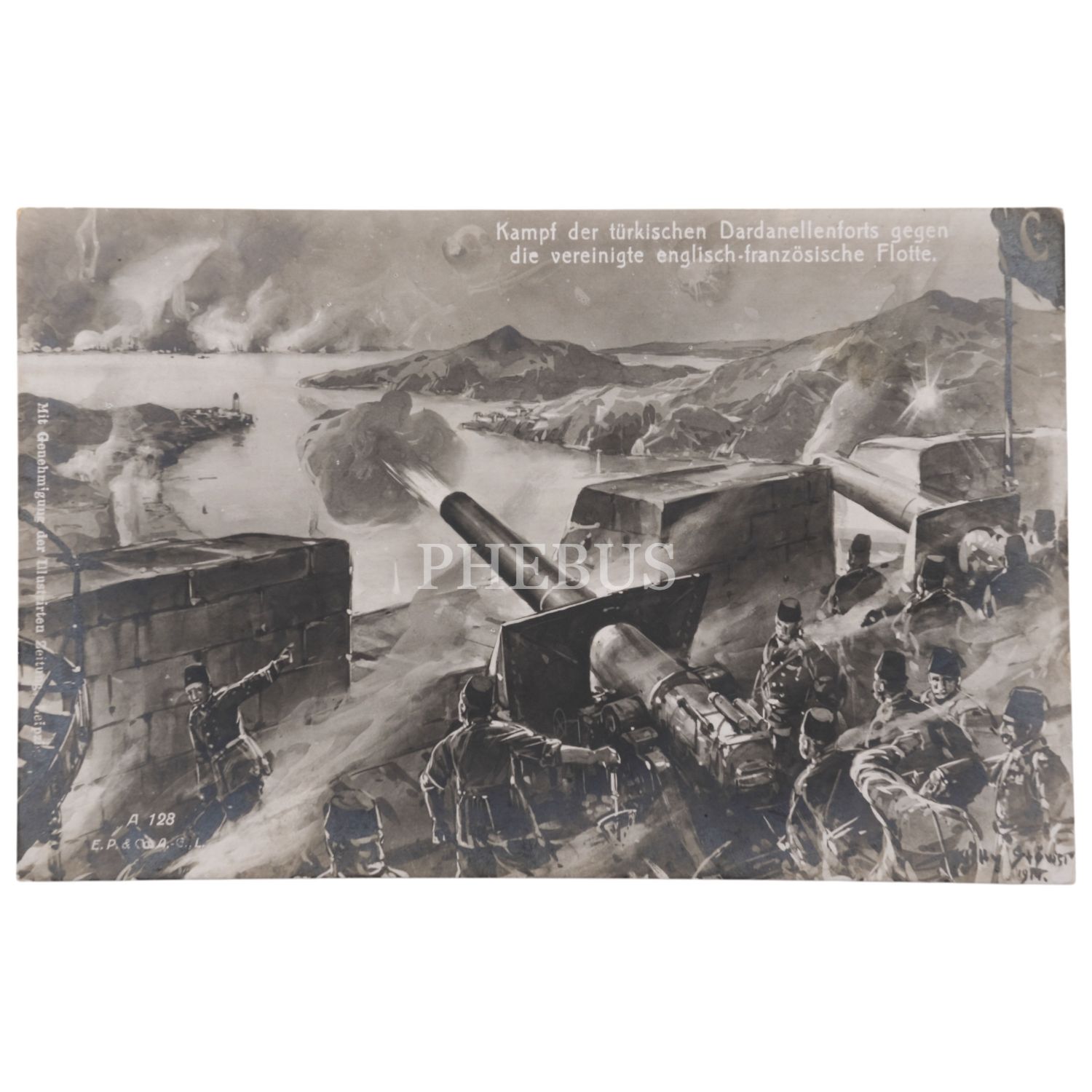 Çanakkale´deki topçu mevzilerinden İtilaf Devleti gemilerinin bombardına tutulmasının resmedildiği, "Kampf der türkischen Dardanellenforts gege die vereinigte englisch-französiche Flotte" yazılı kartpostal, 14x9 cm...