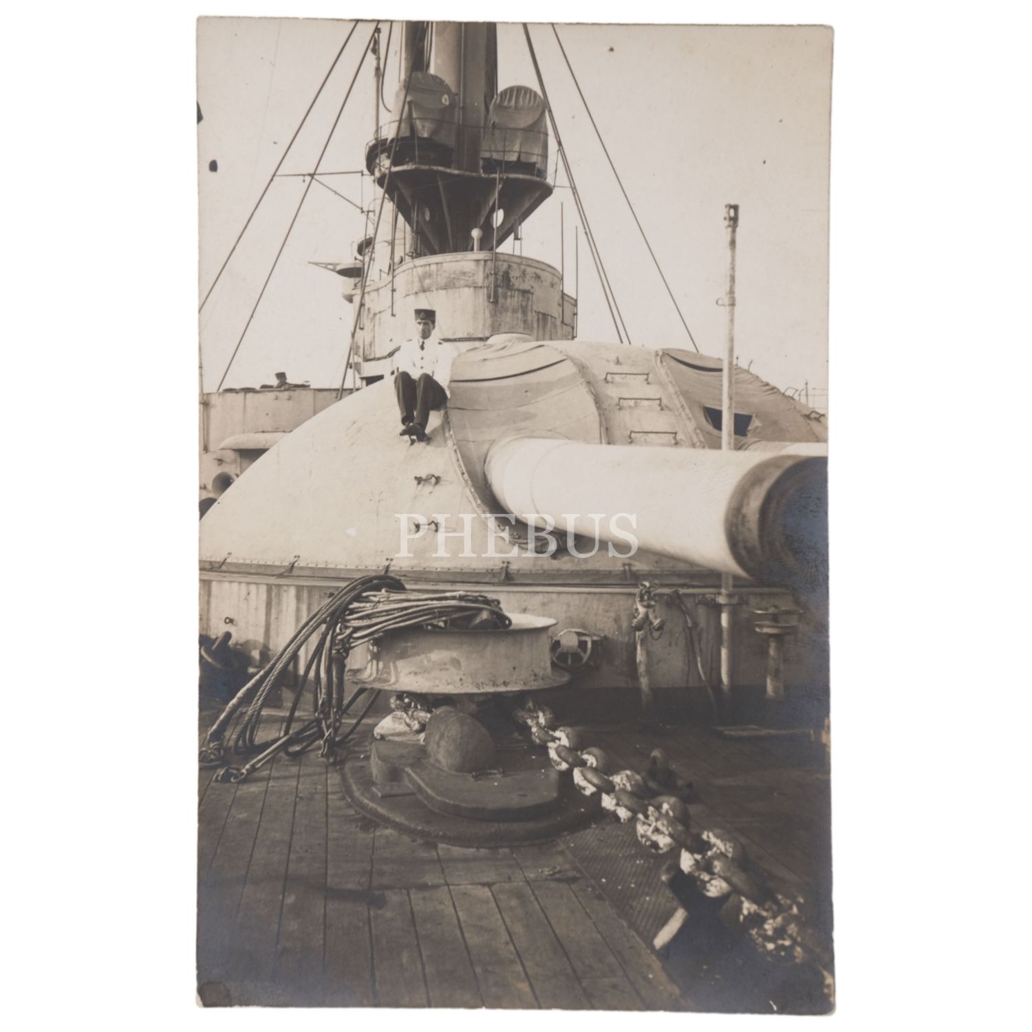 Bir zırhlının topu üzerinde poz veren bahriyeli subay, 9x14 cm...