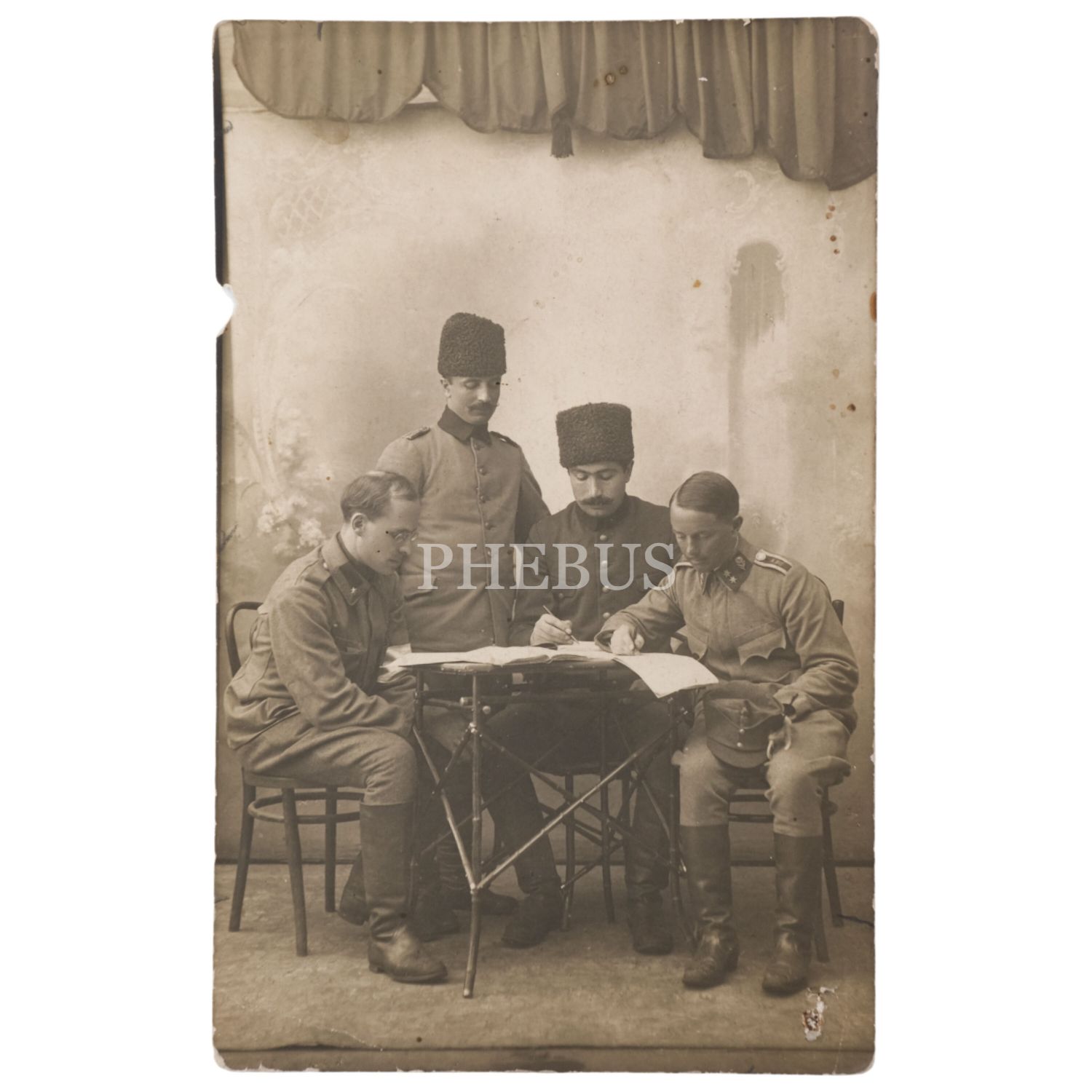 Türk ve Alman subayların, harita üzerinde harekat planı yapar vaziyette aldırdıkları stüdyo hatıra fotoğrafı, 9x14 cm...
