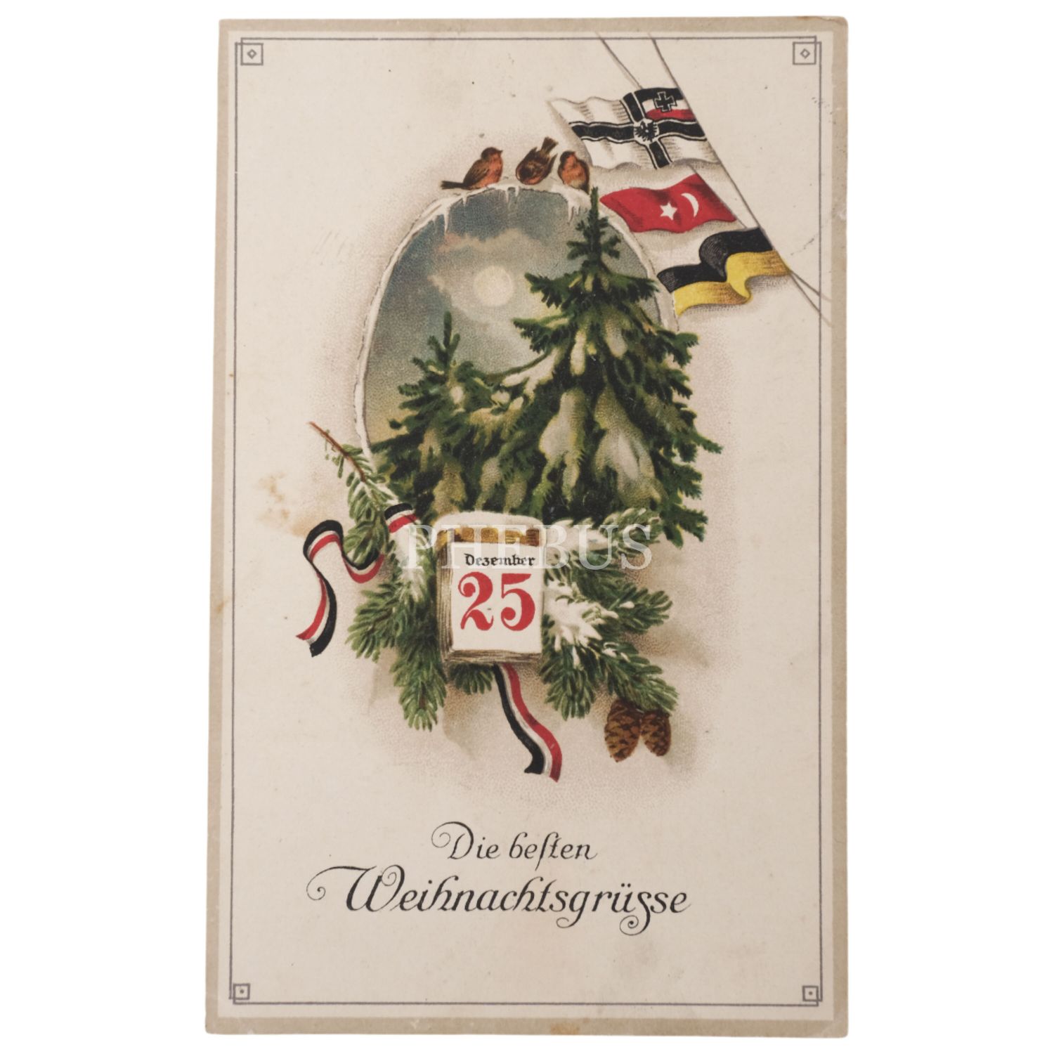 İttifak Devletleri´nin bayraklarının yer aldığı, Noel mesajı temalı ittifak kartpostalı, "Die besten weihnachtsgrüsse", 9x14 cm...
