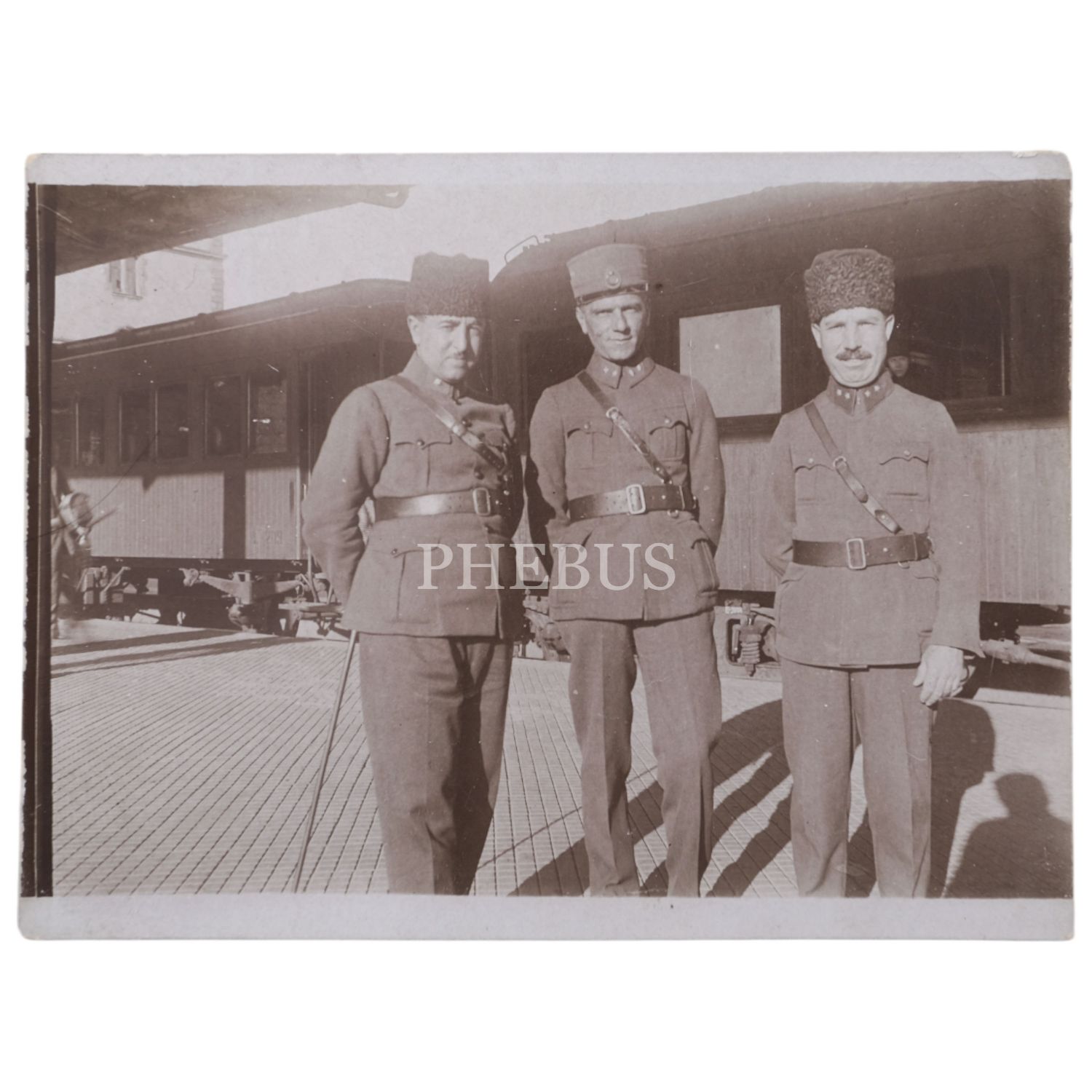Üç Türk subayının tren istasyonunda çekilmiş hatıra fotoğrafı, 12x9 cm...