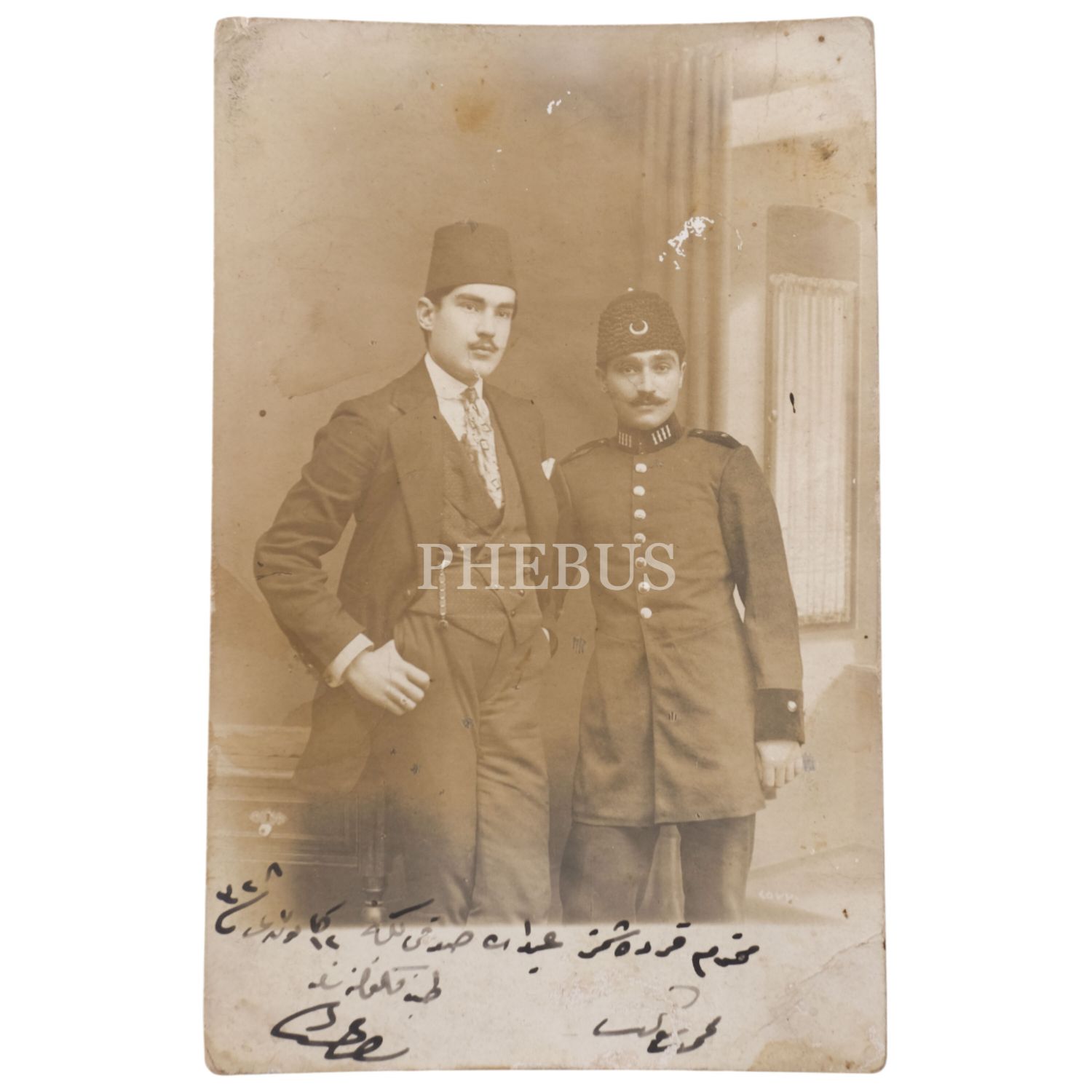 Hilal kalpaklı üniformasıyla bir Osmanlı subayı ve bir beyefendinin, Resne Fotoğrafhanesi´nde çektirdikleri hatıra fotoğrafı, 9x14 cm...