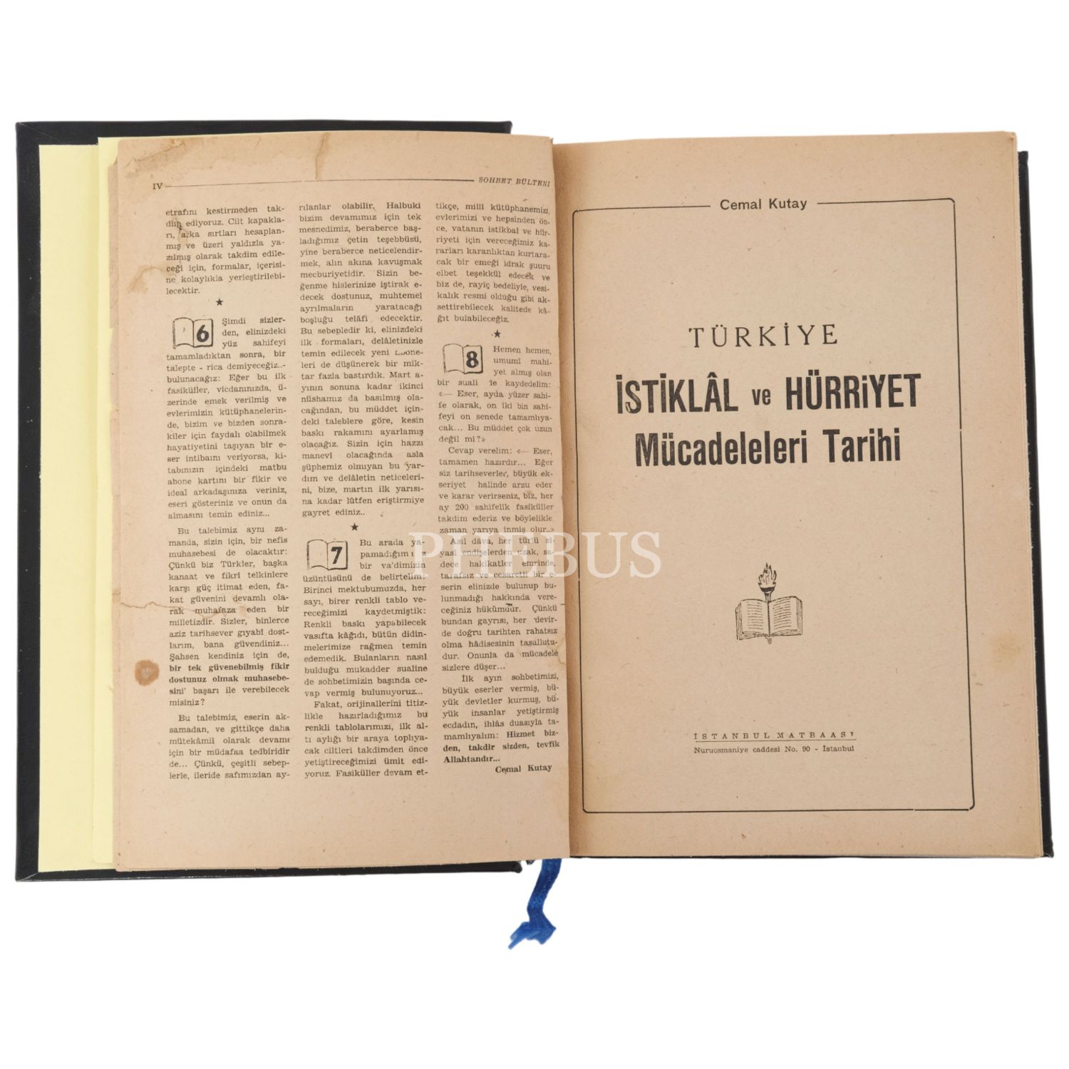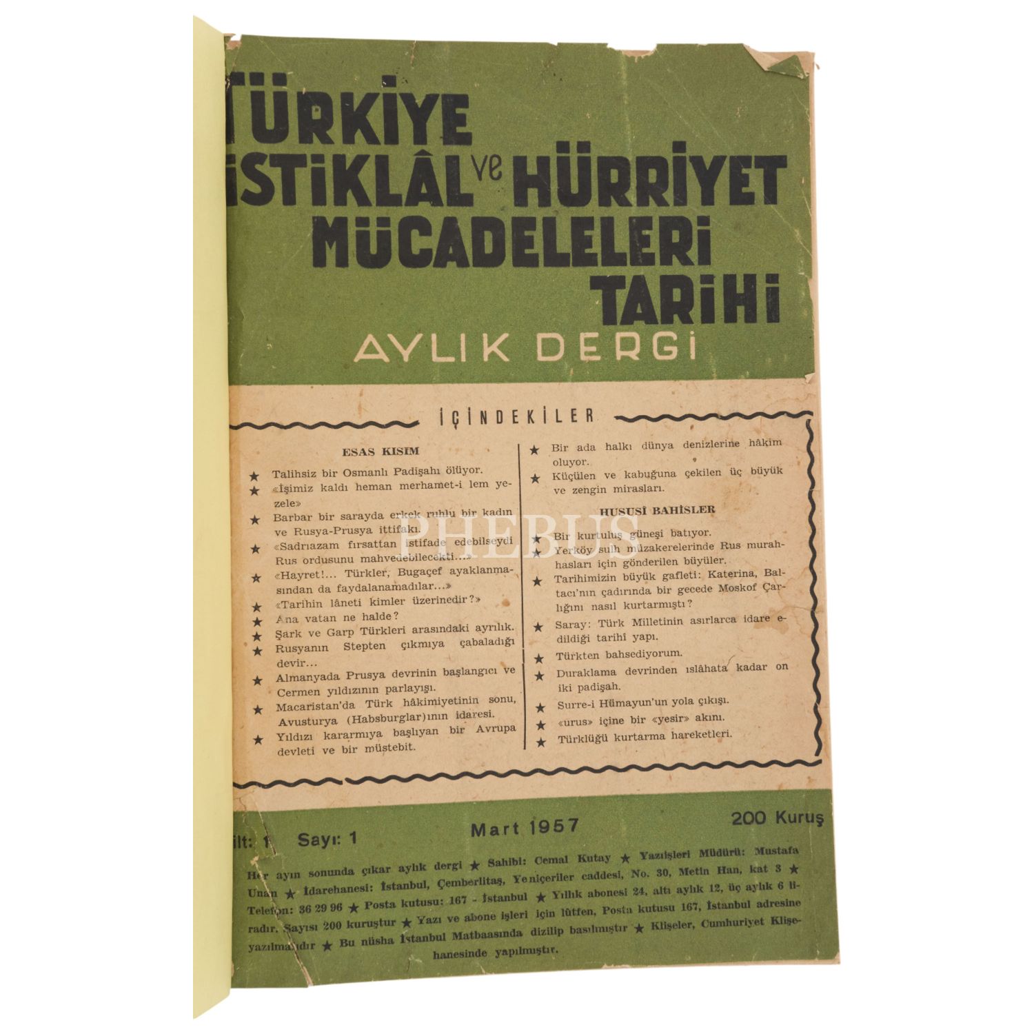 TÜRKİYE İSTİKLÂL VE HÜRRİYET MÜCADELELERİ TARİHİ dergisinin, Mart 1957 ilâ Eylül 1957 tarihleri arasında yayımlanan ilk 7 sayısı tek ciltte, sahibi: Cemal Kutay, 864 sayfa, 18x25,5 cm...