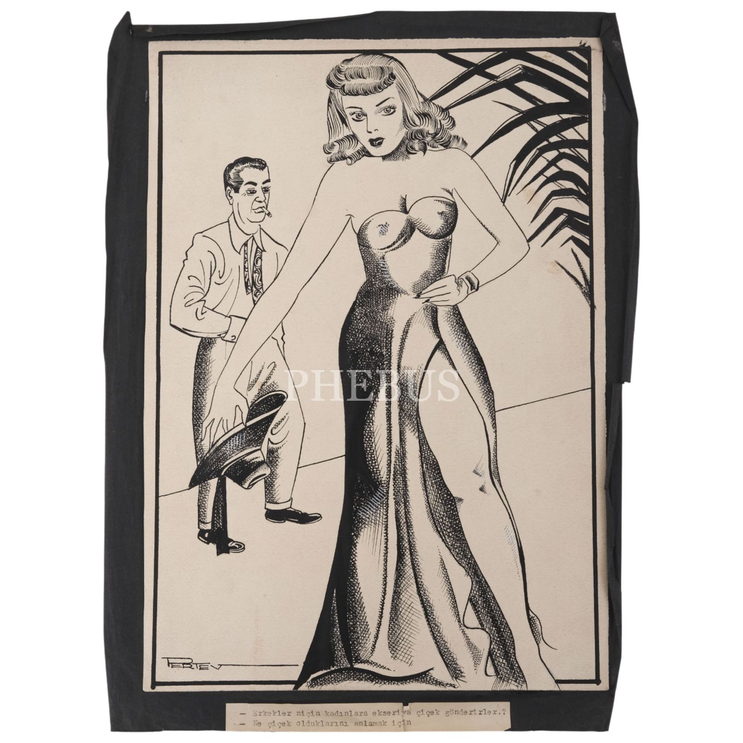Karikatürist Pertev Ertün´den imzalı orijinal karikatür çizimi, 25x36 cm...