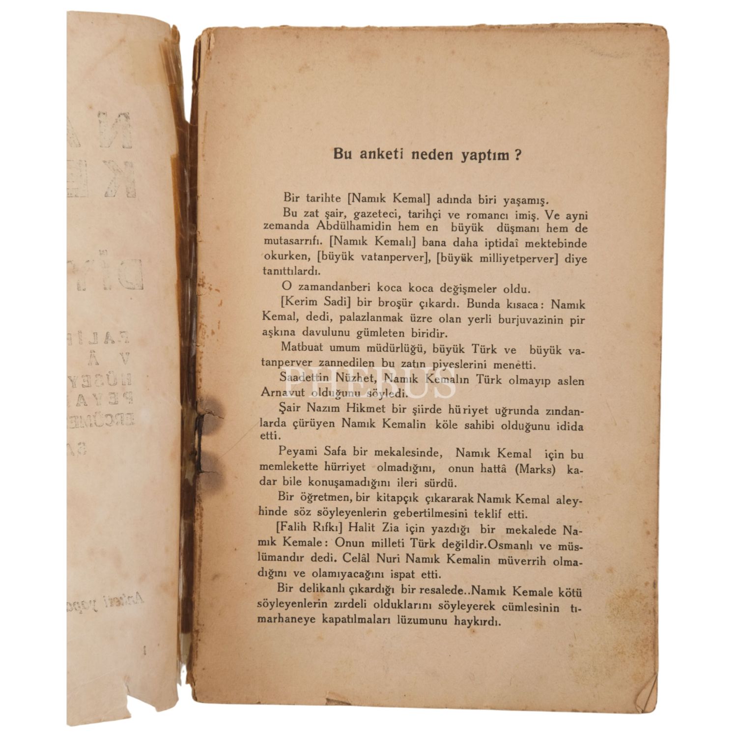 Kemal Tahir´in yayımlanmış ilk eseri olan bu küçük kitap, yazarın Namık Kemal hakkında hazırladığı anket sorularına; Falih Rıfkı, Vâlâ Nureddin, Hüseyin Cahit, Peyami Safa, Ercüment Ekrem, Sadettin Nüzhet, Kerim Sadi, Dr. Fuad Sabit, Nâzım Hikmet, Hüseyin Avni ve Suat Derviş’in verdiği cevaplardan oluşuyor. Namık Kemal´in, işret sofrasında Peygamber´in adı geçtiğinde rakıyı dışarı çıkarıp salavat getirmesi ama her akşam da içki içmeye devam etmesi gibi ilginç ayrıntılar içeren kitap, yayımlandığı dönemde küçük çaplı bir kıyamet koparmıştı. *Cildi yıpranmış, sırtı bantla tamir edilmiş ve sayfalar ciltten ayrılmıştır.