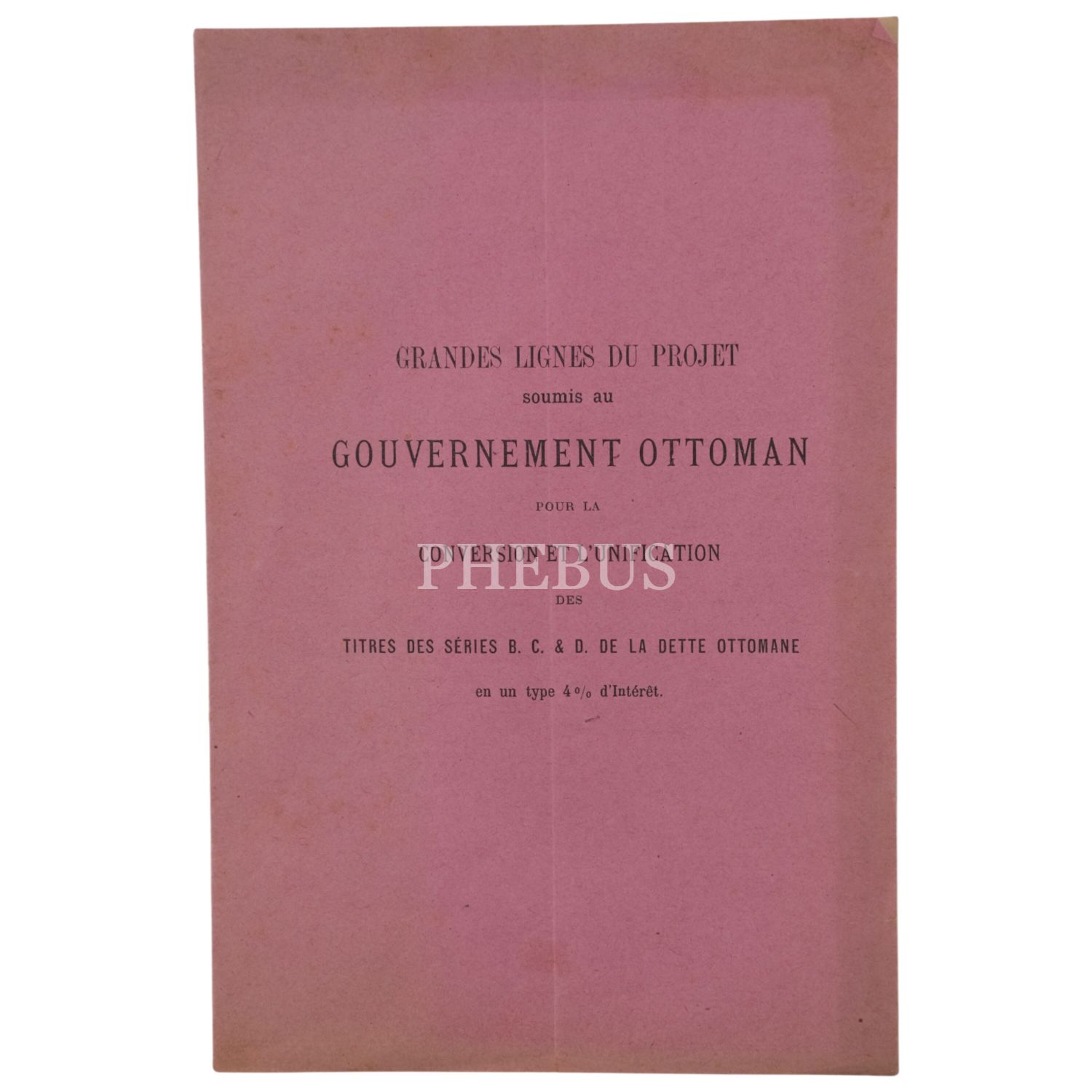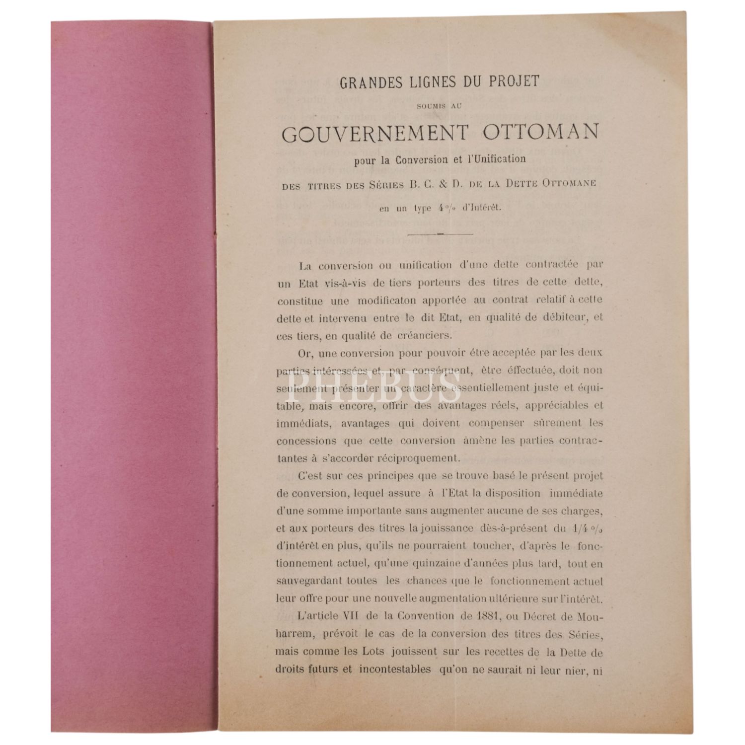 GRANDES LIGNES DU PROJECT SOUMIS AU GOUVERNEMENT OTTOMAN POUR LA CONVERSION ET L´UNIFICATION DES TITRES DES SERIES B. C. & D. DE LA DETTE OTTOMANE EN UN TYPE %4 D´INTERET, 8 sayfa, 16x25 cm...