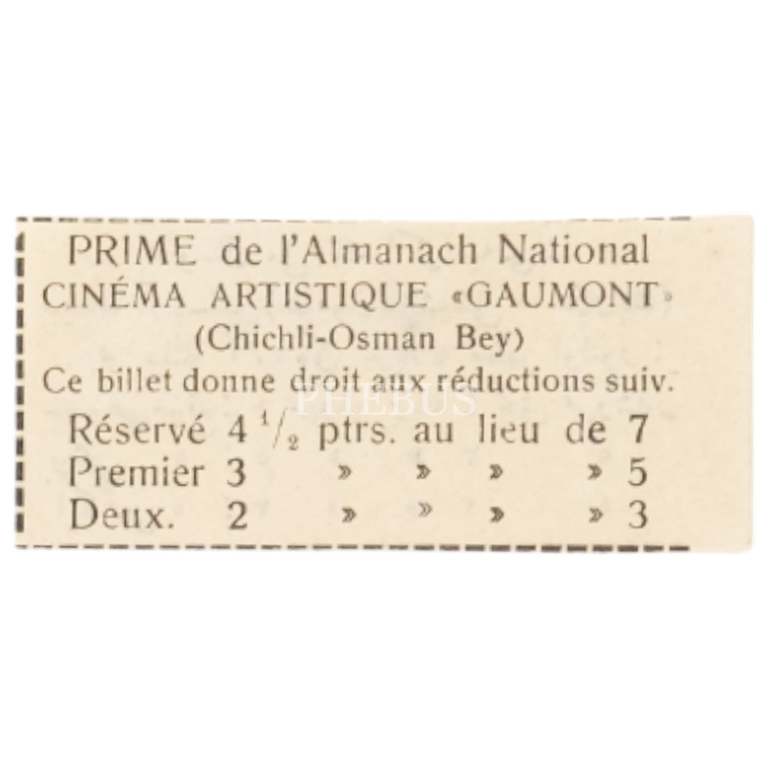 1330 senesinde yayın hayatına başlayan ve konusunun ekserisini güzel sanatların oluşturduğu Nevsal-i Milli dergisinin Artistik Sineması´nda gösterilen filmlerde kullanılmak üzere dağıttığı Osmanlıca ve Fransızca indirim bileti, 7x3 cm...