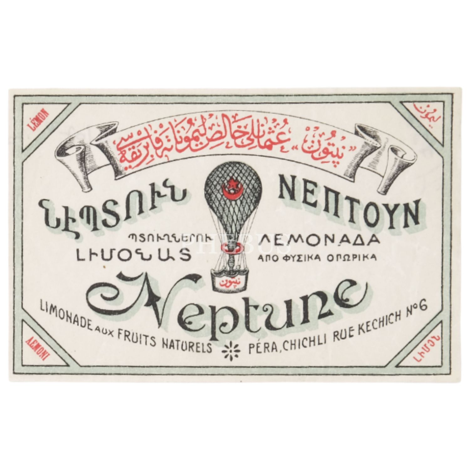 Neptün Osmanlı Halis Limonata Fabrikası´nın Osmanlıca, Rumca ,Ermenice ve Fransızca etiketi, 12x8 cm...