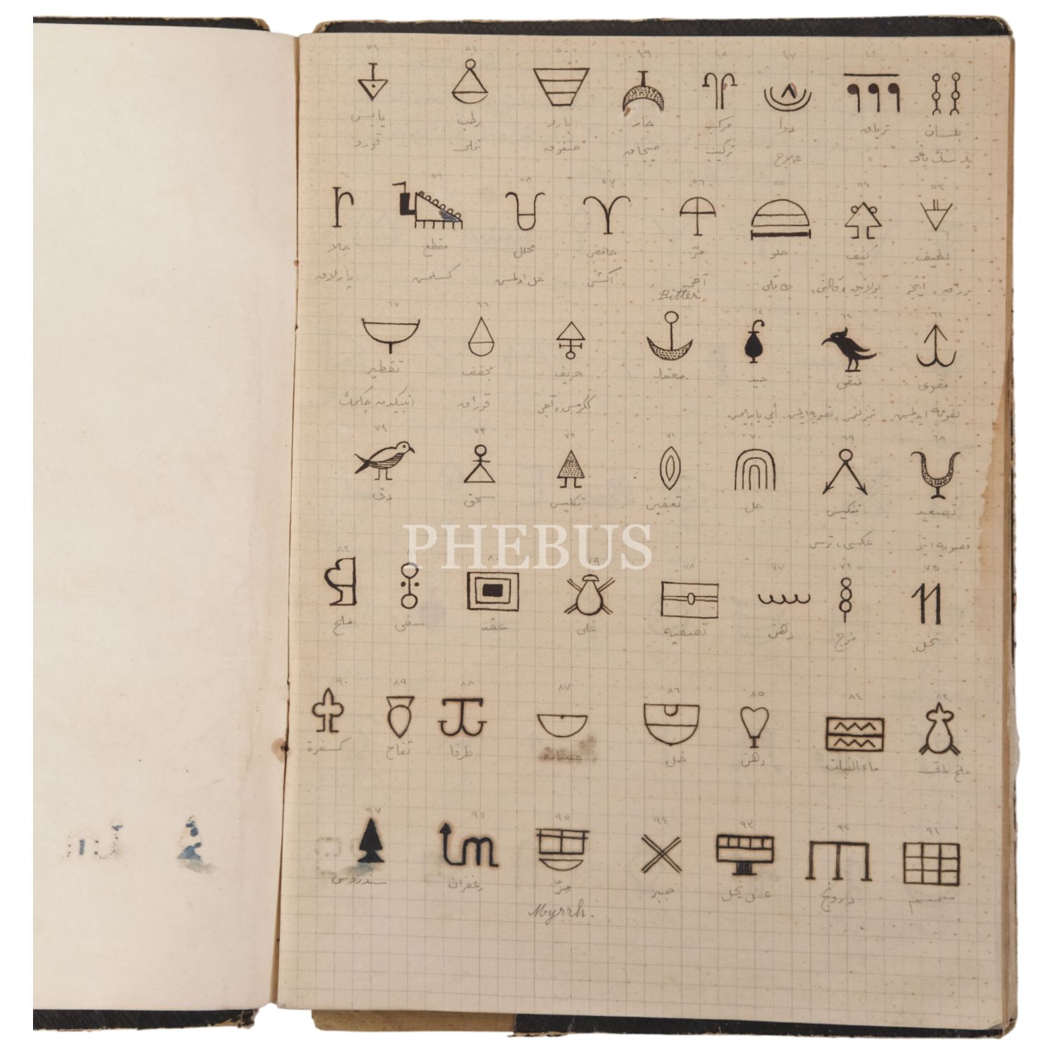 Hammer tarafından kaleme alınan "Ancient Alphabets and Hieroglyphic Characters Explained with an Account of Egyptian Priests" adlı eserinin, el yazısıyla hazırlanmış Arapça tercümesi, 2 cilt, 20x28 cm...