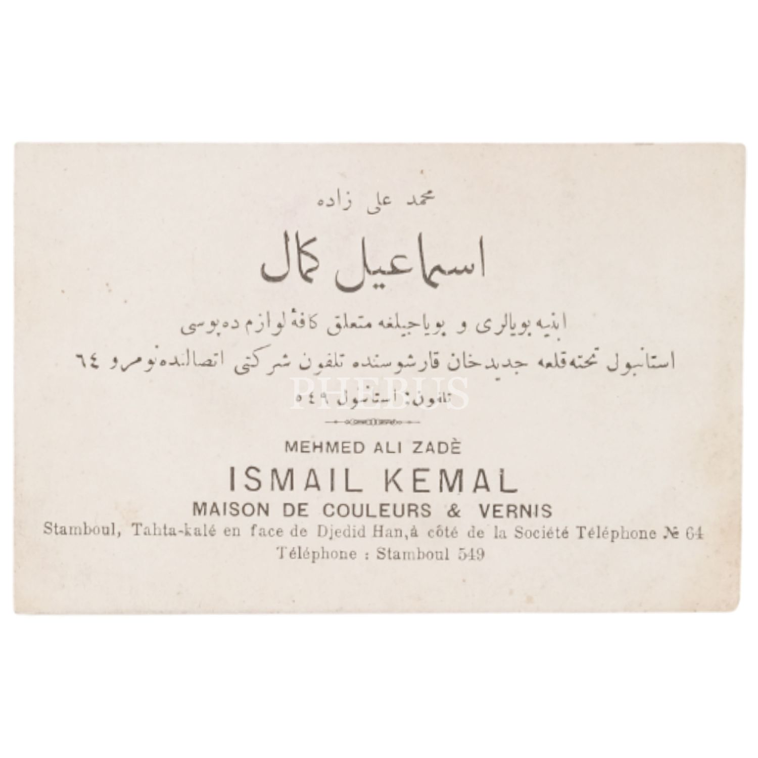 Boya ve boyacılığa dair eşya deposu "Mehmed Alizade İsmail Kemal" ´in Osmanlıca ve Fransızca işyeri kartı, 12x8 cm...