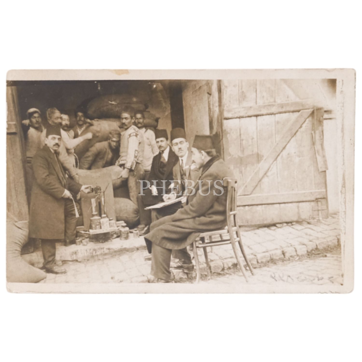 Bir zahire ambarının teftişi esnasında memurlar ve esnafın hatıra fotoğrafı, 2 Mart 1338 tarihli, 14x9 cm...