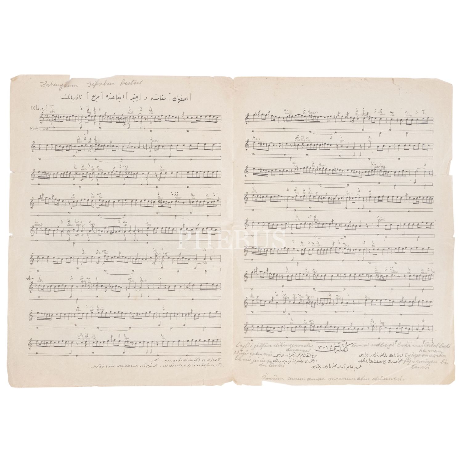 Darü´l-elhan Külliyatı´ndan Zaharyan Efendi´nin İsfahan makamındaki bestesinin notaları, 25x35 cm...