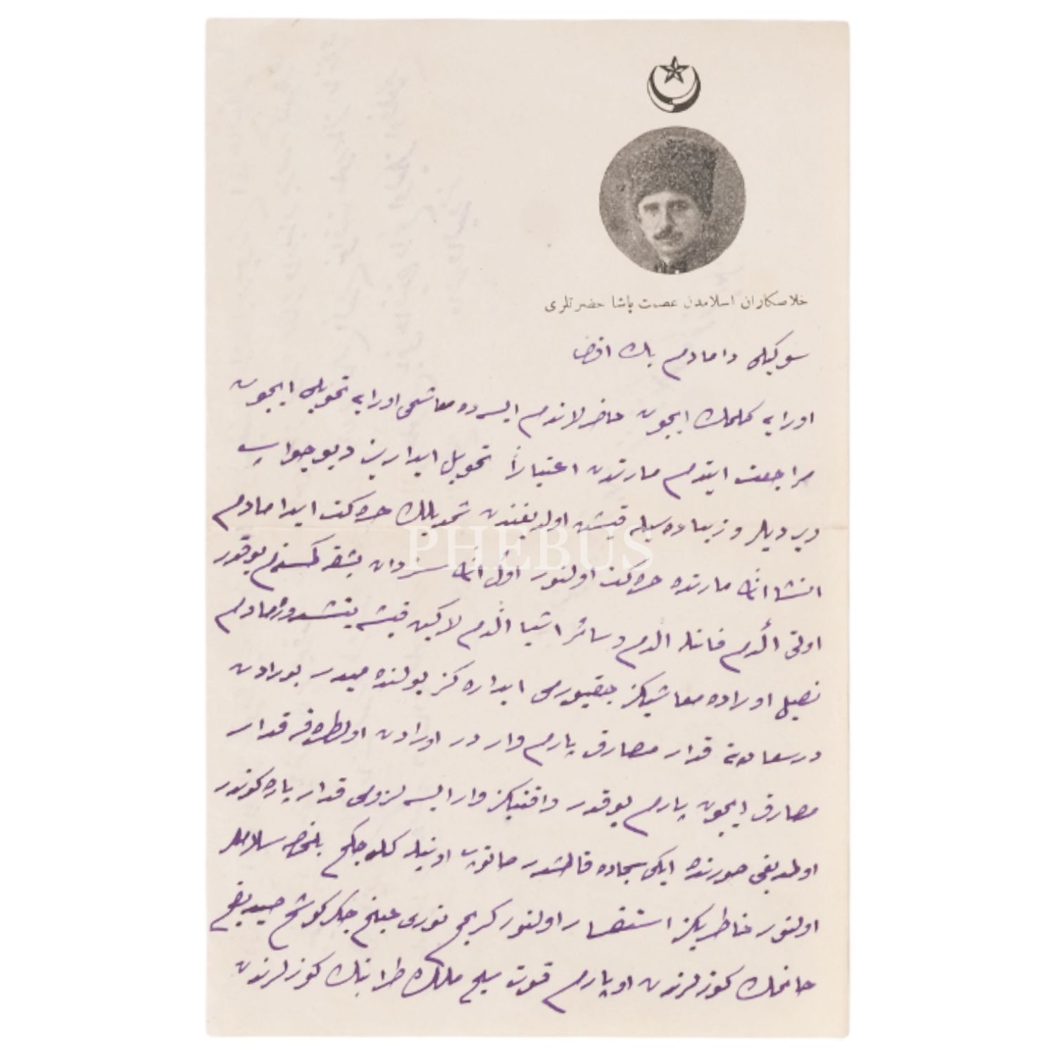 Antetinde "Halaskaran-ı İslamdan İsmet Paşa Hazretleri" altbaşlığıyla İsmet İnönü´nün fotoğrafına verilen mektup, 26x20 cm...