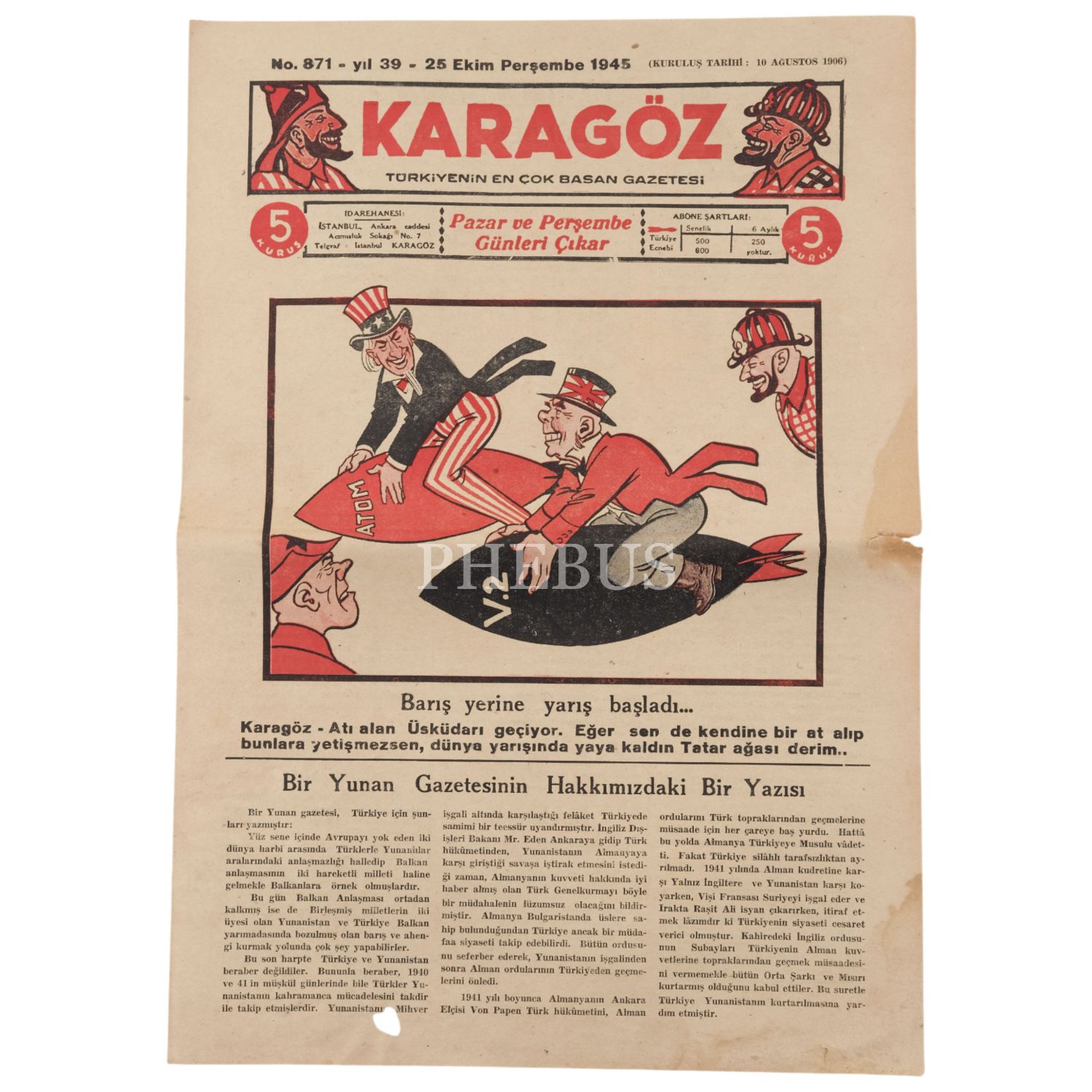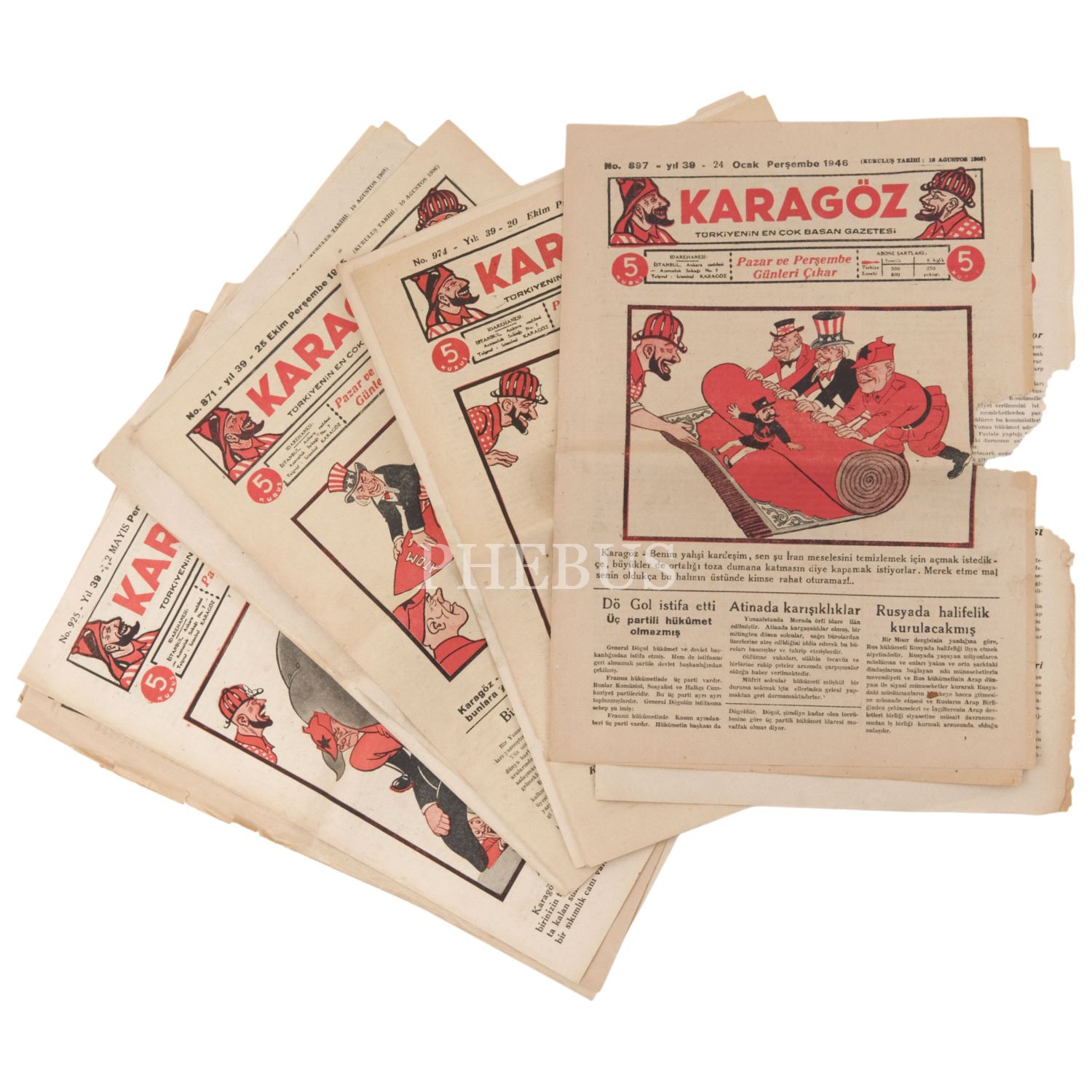 "Türkiyenin En Çok Basan Gazetesi" KARAGÖZ´ün, 1945-1946-1947 yıllarında yayımlanan 10 sayısı, 29x40 cm...