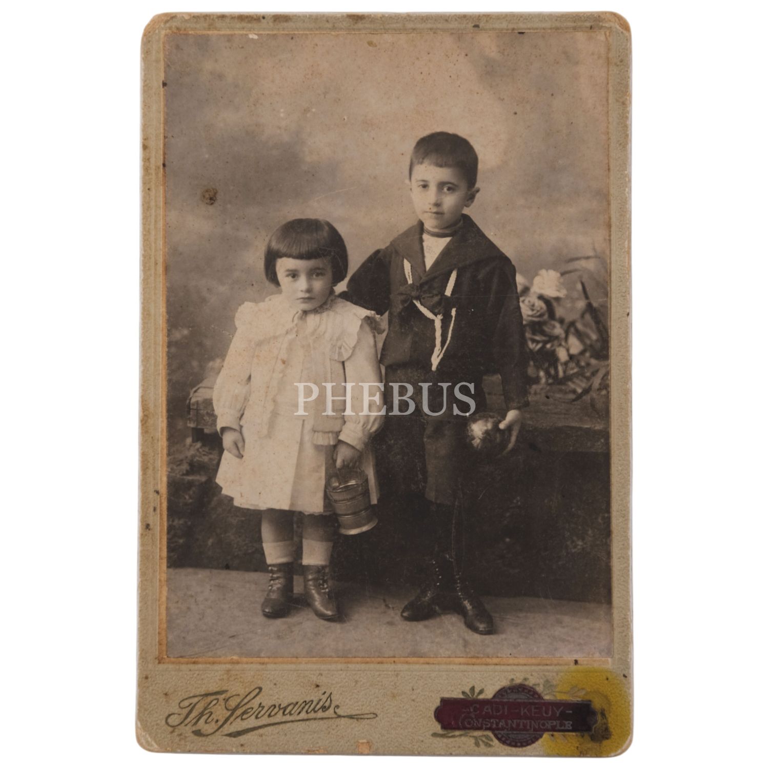 İki sevimli çocuğun Th. Servanis Fotoğrafhanesi´nde (Cadi-Keuy [Kadıköy], Constantinople) çekilmiş kabin fotoğrafı, 11x16,5 cm...