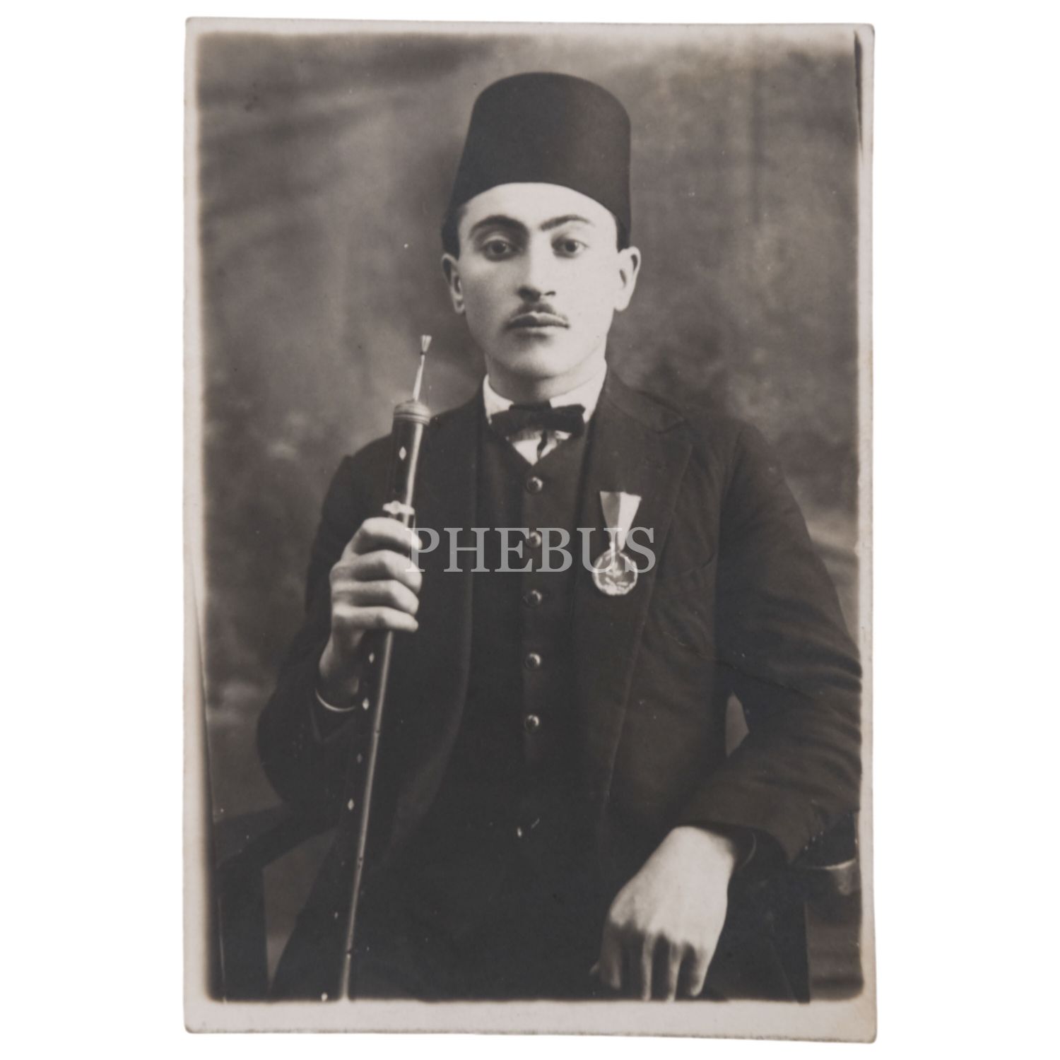Elinde enstrümanıyla poz veren madalyalı bir gencin stüdyo portre fotoğrafı, 6x9 cm...