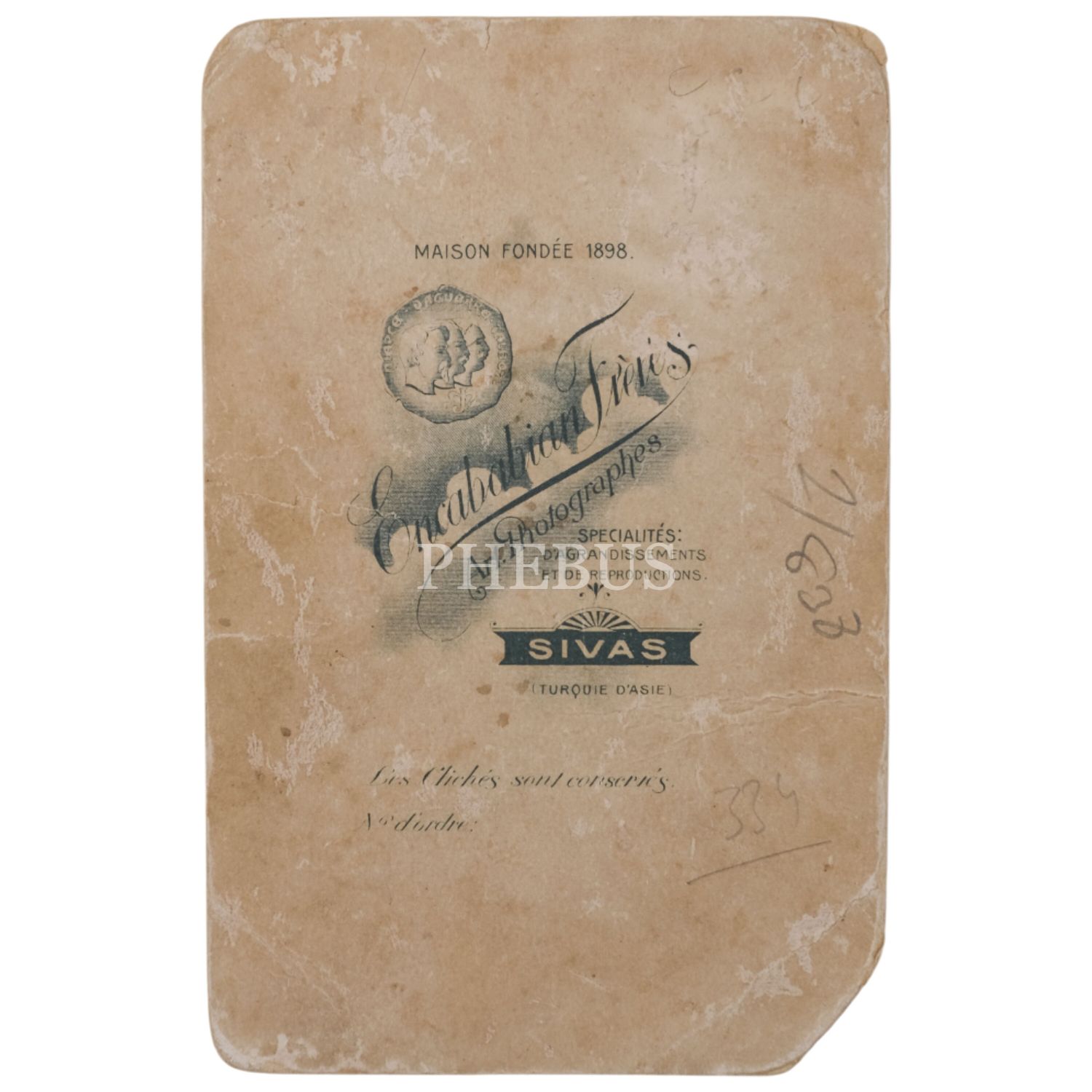 Bir beyefendi´nin, Sivas´ta bulunan Ermeni fotoğrafçı Encababian Freres´in stüdyosunda aldırdığı kabin fotoğrafı, 11x17 cm...