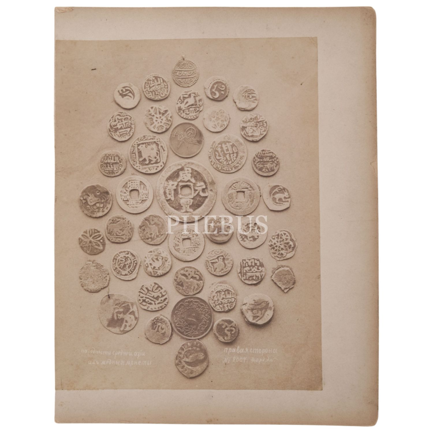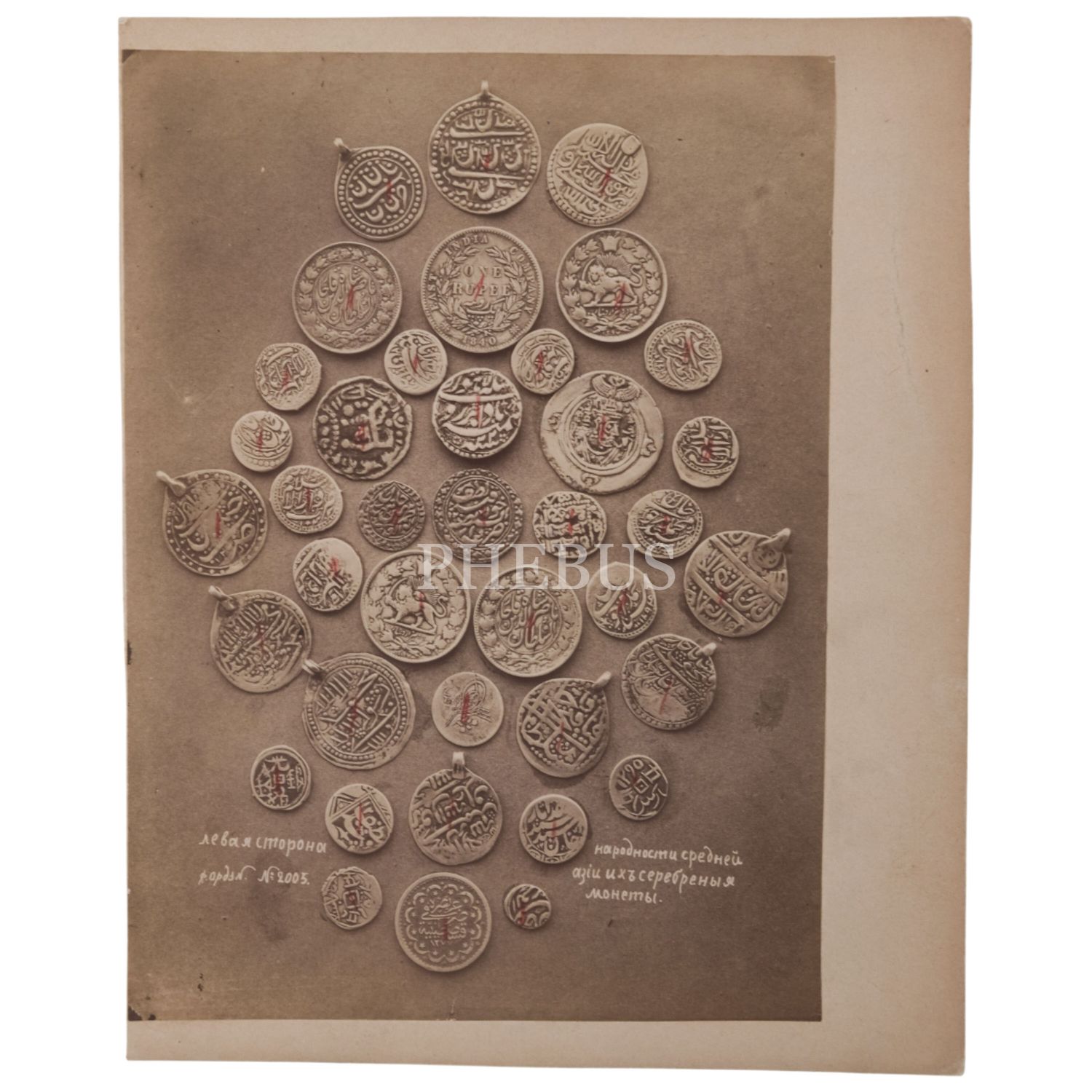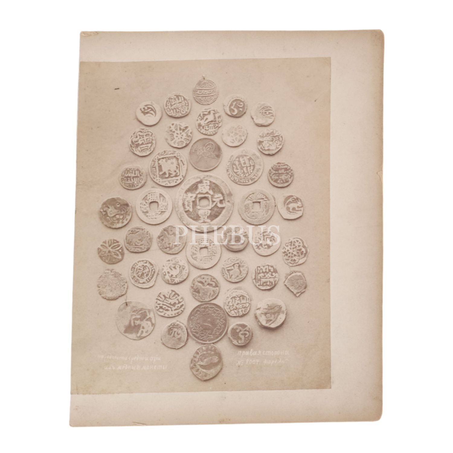 Anadolu´da kullanılmış antik sikkelerden çeşitli grupların Rum bir fotoğrafçı tarafından çekilmiş üç adet albümin baskı fotoğrafı, her biri kartona yapışıktır, 19,5x25 cm...
