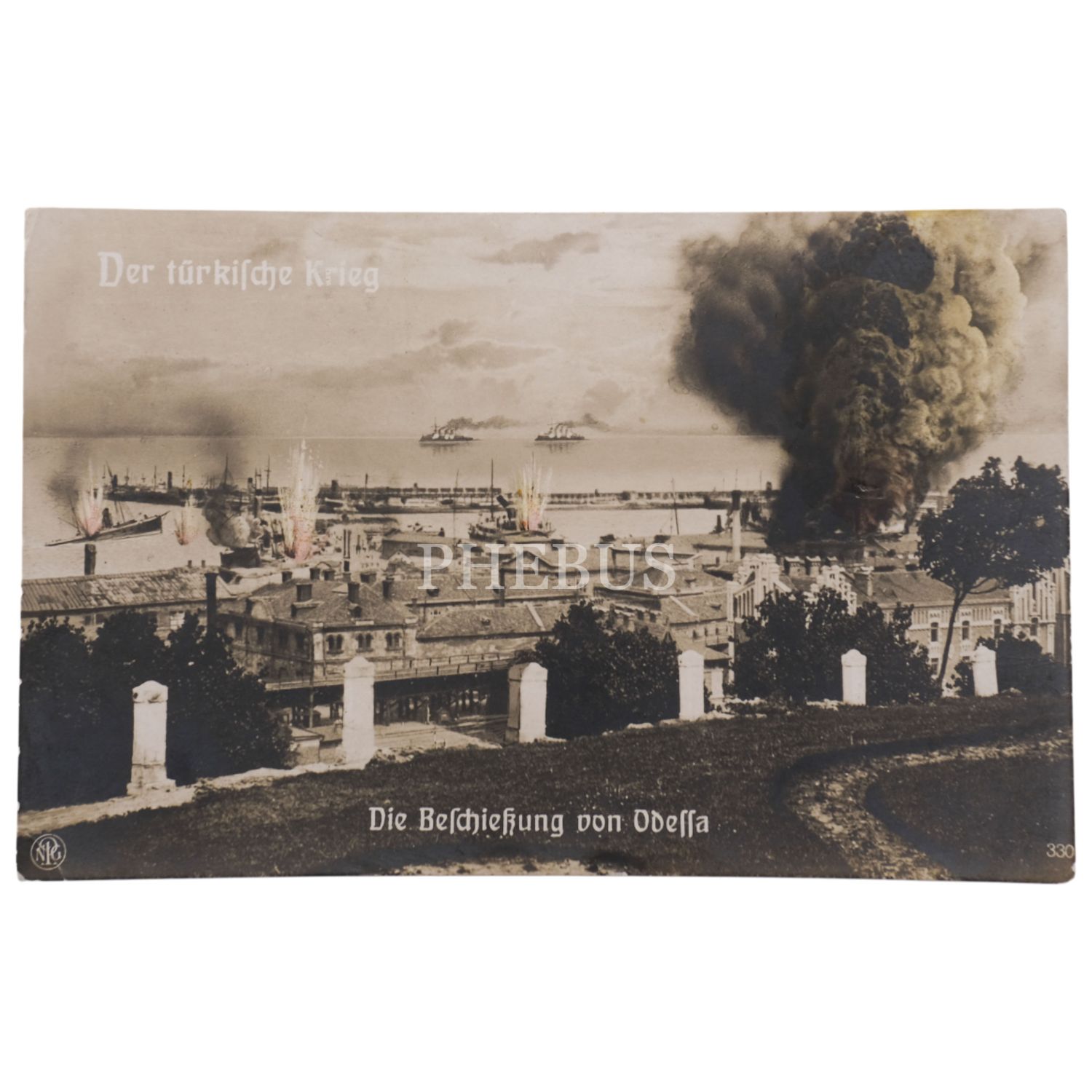 30 Ekim 1914´te Enver Paşa´nın emriyle Karadeniz´deki Rus limanlarından Odessa´yı bombalayan Gayret-i Vataniye ve Muâvenet-i Milliye gemileri görselli kartpostal, "Der türkische Krieg", 14x9 cm...