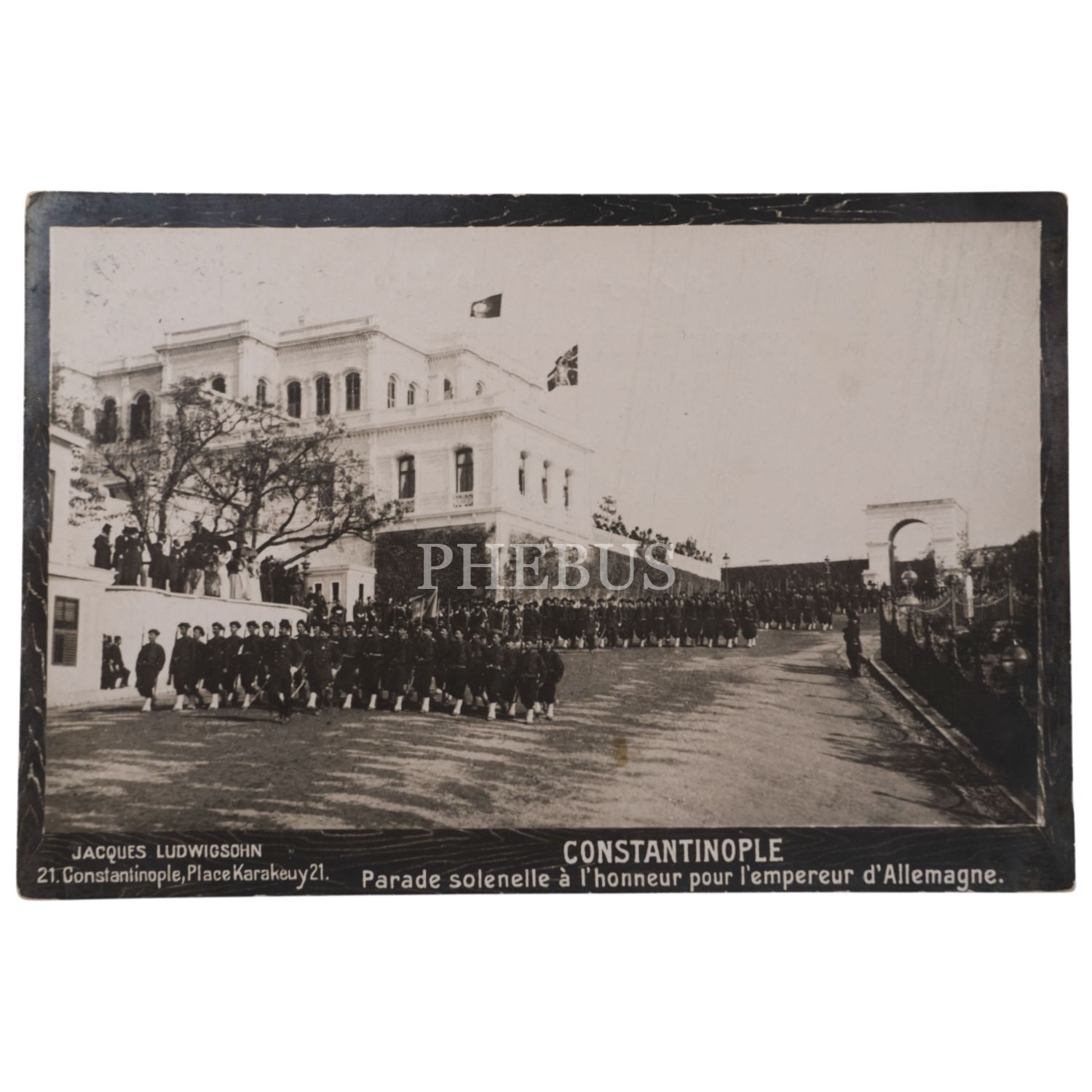 İstanbul´u ziyaret eden Alman İmparatoru Kayzer II. Wilhelm´in şerefine Yıldız Sarayı´nda tertip edilen görkemli geçit merasiminden bir manzara, "Constantinople - Parade solenelle a l´honneur pour l´empereur d´Allemagne", ed. Jacques Ludwigsohn, Place Karakeuy, 15x10 cm...