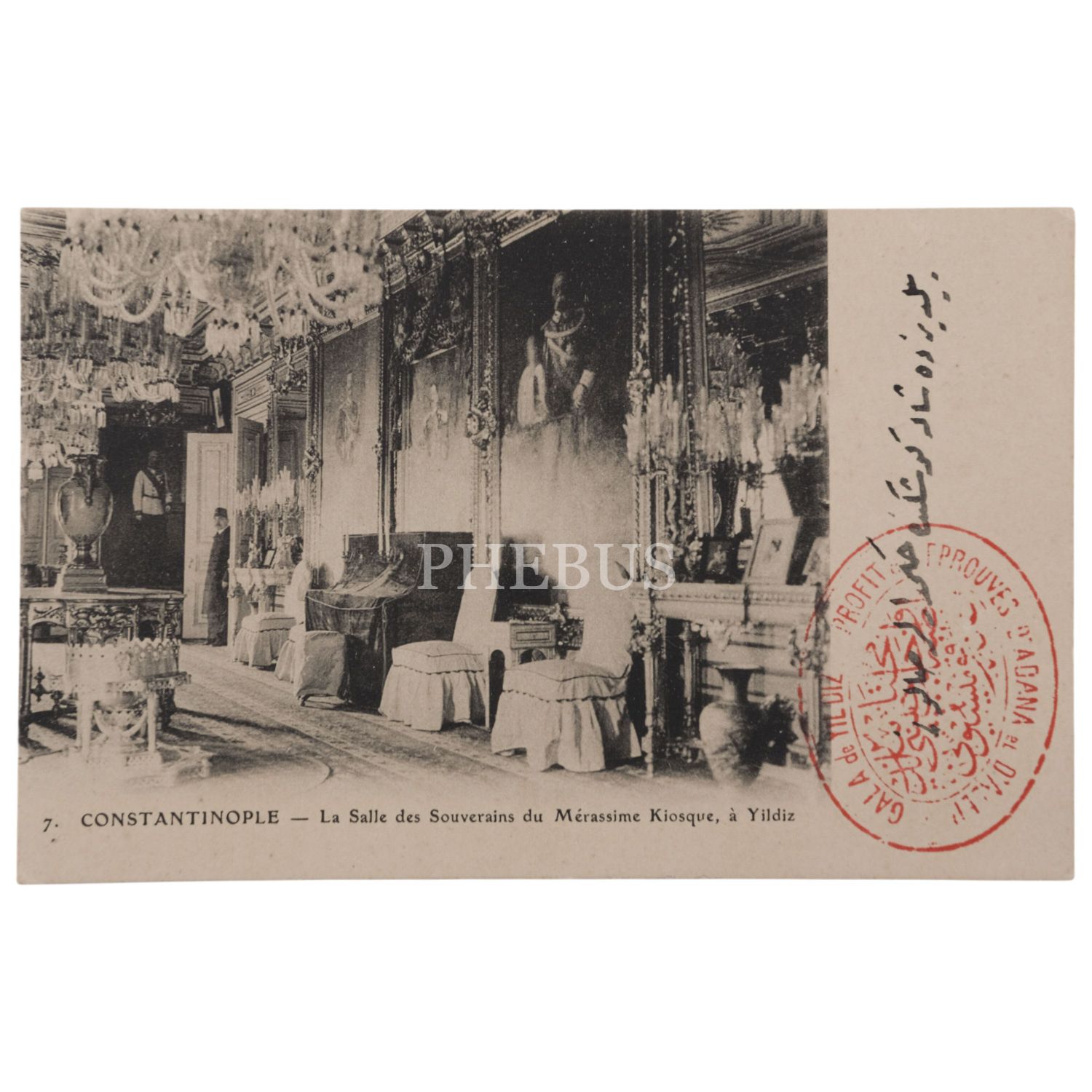 Yıldız Sarayı´nda bulunan Merasim Köşkü´nün içinden bir görünüm, "Constantinople - La Salle des Souverains du Merasime Kiosque, a Yildiz", 14x9 cm...