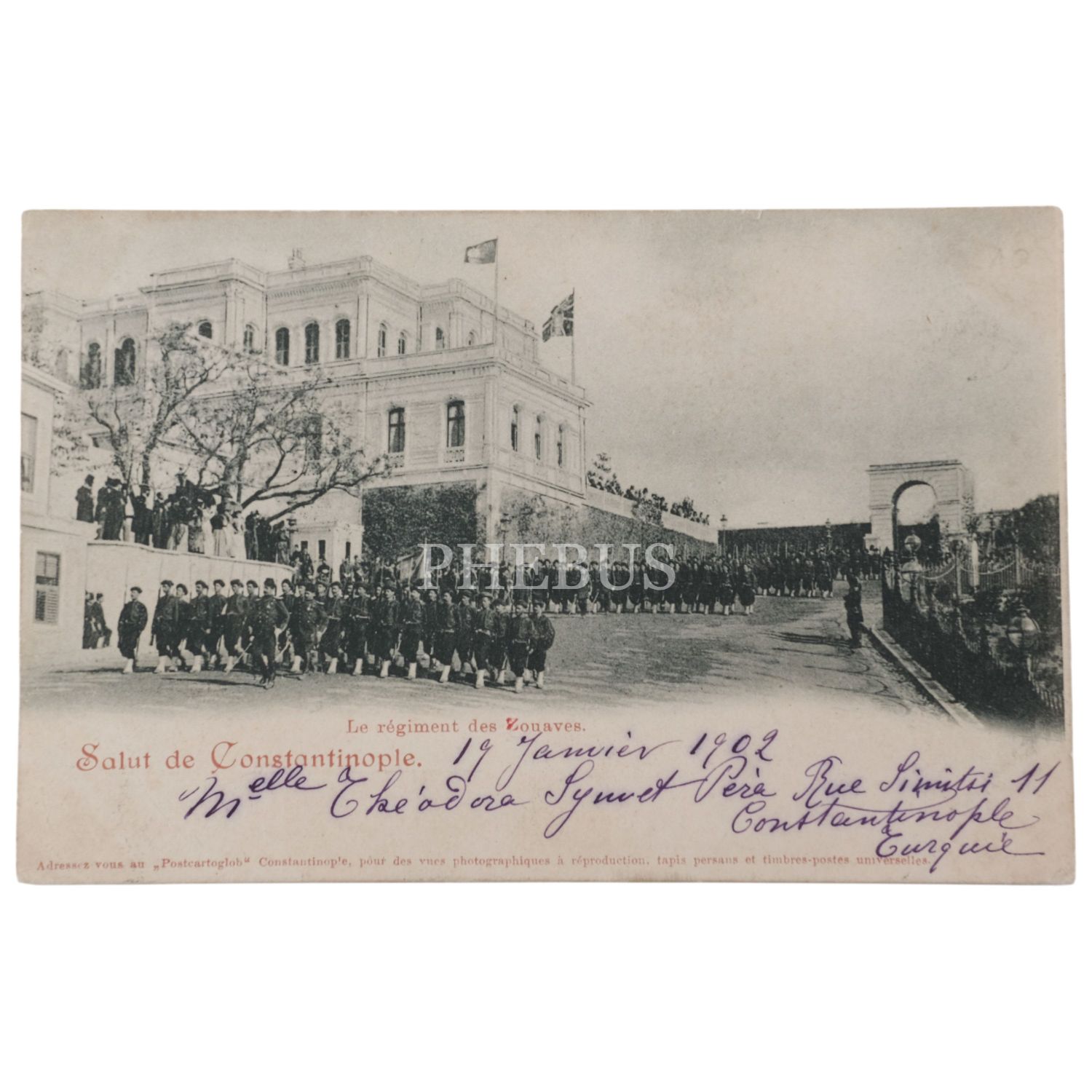 Yıldız Sarayı´nda geçit merasimi yapan Zuhaf Alayı, "Salut de Constantinople - Le regiment des Zonaves", 14x9 cm...