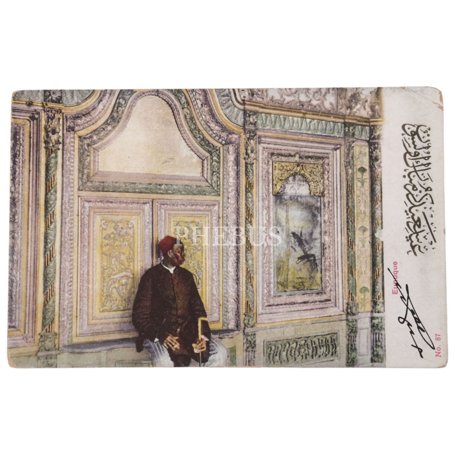 Yıldız Sarayı´nın harem dairesinde Harem Ağası Nadir Ağa görselli, Osmanlıca bayram tebrik notlu kartpostal, 14x9 cm...