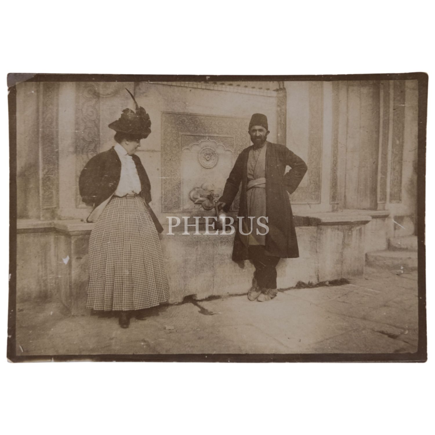 Çeşmeden su dolduran fesli tip ve kendisini izleyen Avrupalı turist kadın, 9x6 cm...