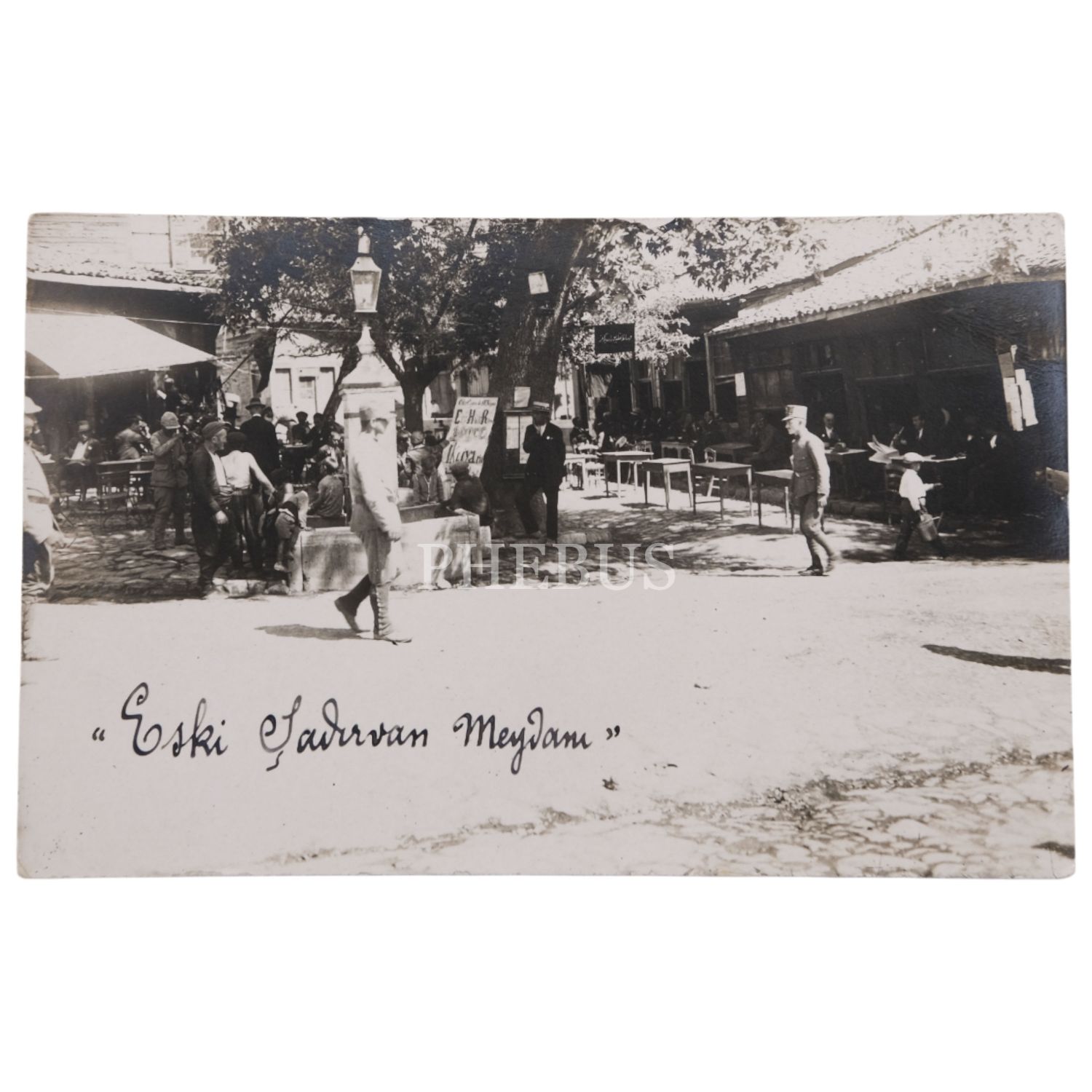 El yazısıyla "Eski Şadırvan Meydanı" başlığı atılmış bir mahal fotoğrafı, çevrede Osmanlıca tabelalar görülmekte, 14x9 cm...