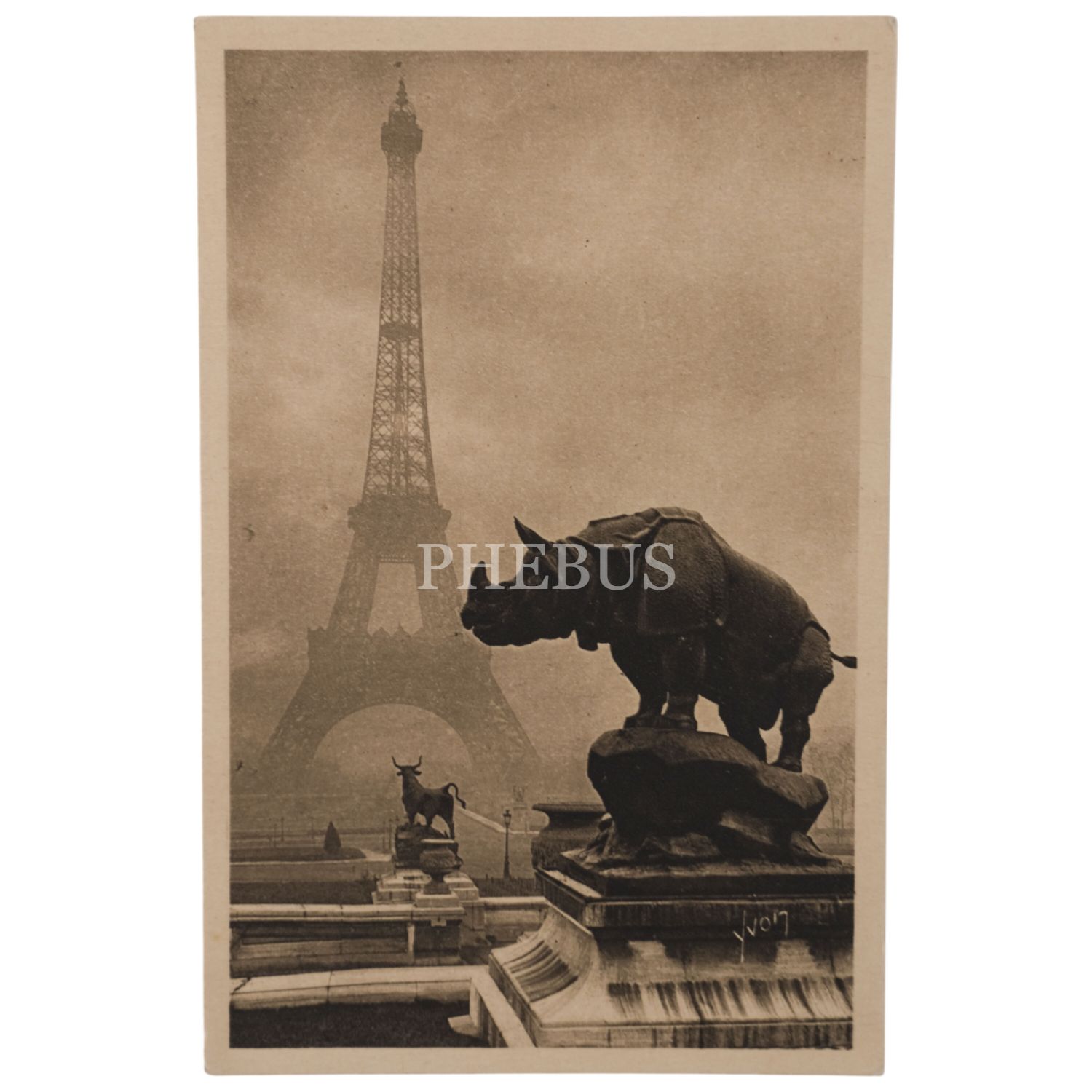 Paris´teki boğa heykeli ve gergedan heykelinin görüldüğü kartpostal, 9x14 cm...
