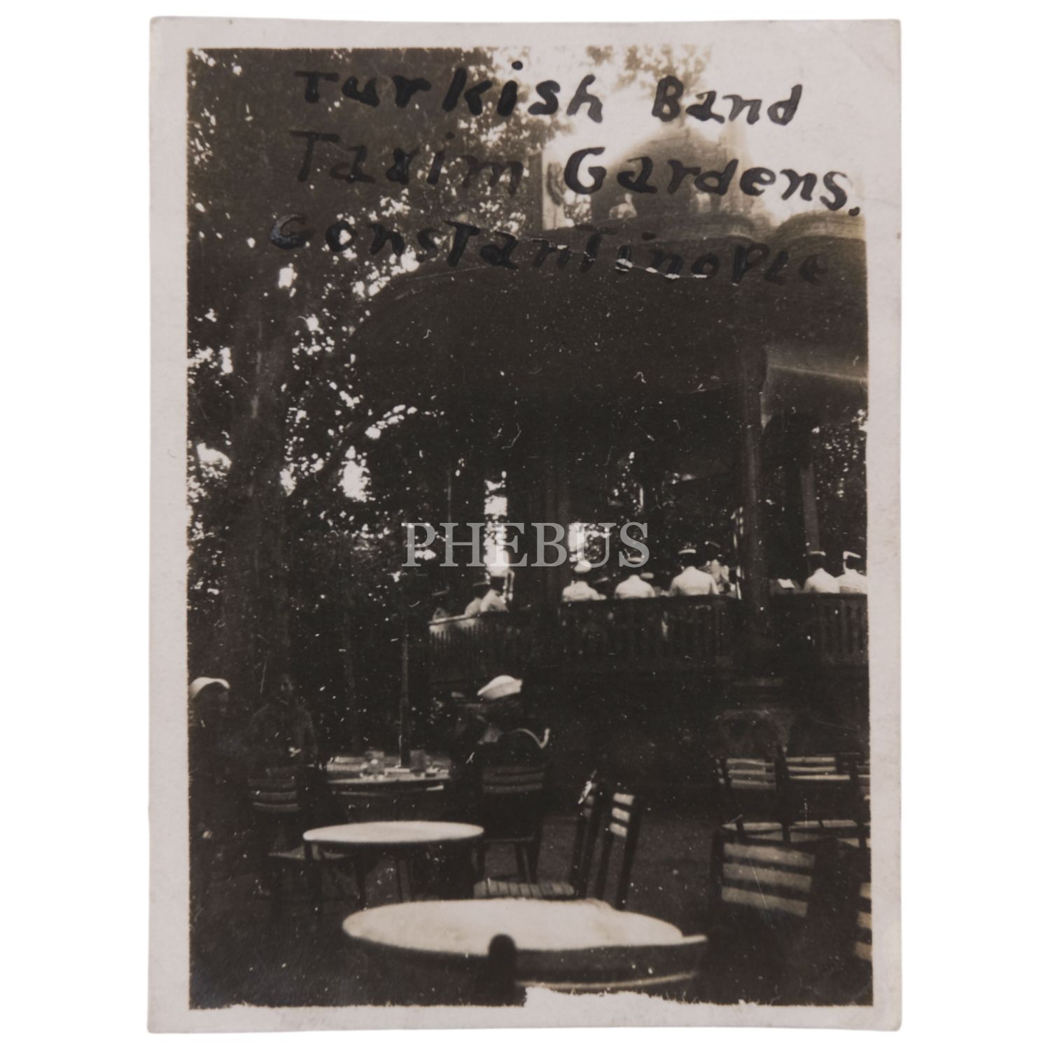 Taksim Bahçesinde konser veren Türk bandosu, "Turkish Band Taxim Gardens. Constantinople", 6x8 cm...