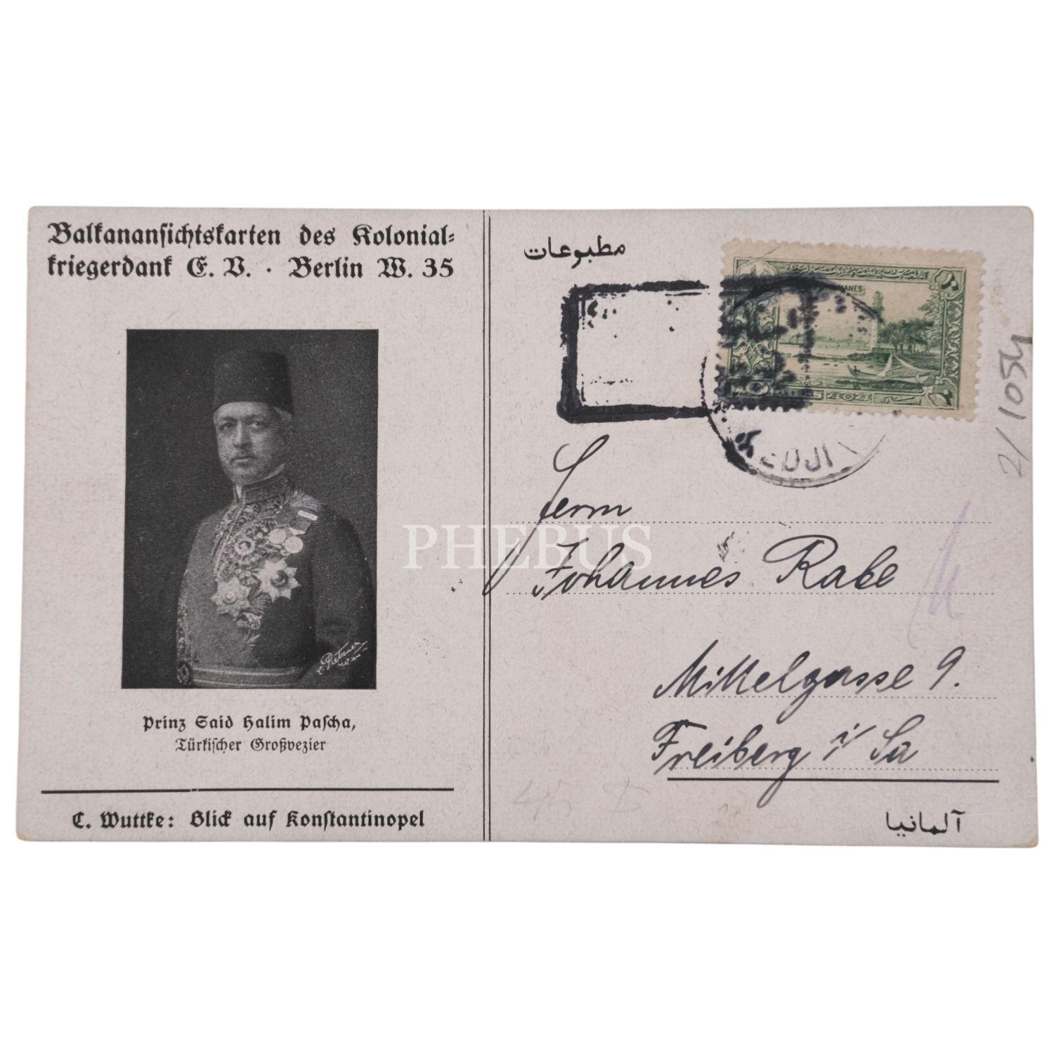 Bir yüzü Said Halim Paşa, bir yüzü de İstanbul görselli çift taraflı kartpostal, "Prinz Said Halim Pacha / Blid auf Konstantinopel", 14x9 cm...