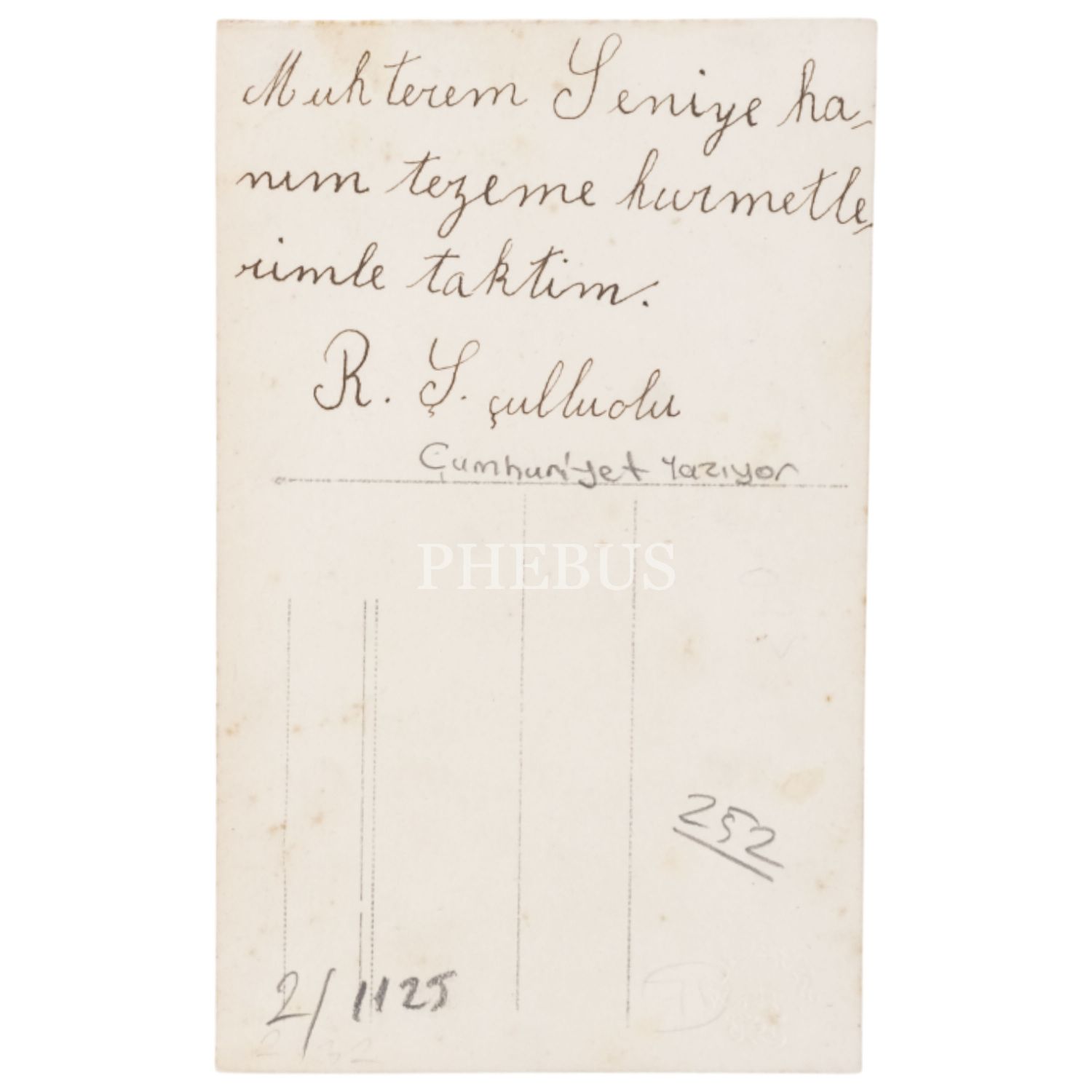 Osmanlıca "Cumhuriyet" yazılı denizci şapkasıyla poz veren küçük bir çocuğun, İzmir´de bulunan Çulluzade Biraderler fotoğrafhanesinde çekilmiş stüdyo hatıra fotoğrafı, arka yüzü -yeni harflerle- ithaflı ve imzalı, "R. Ş. Çulluolu" ibaresiyle imzalanan fotoğrafın Çulluzade Biraderler´in akrabasına ait olduğunu düşünmekteyiz, 9x14 cm...