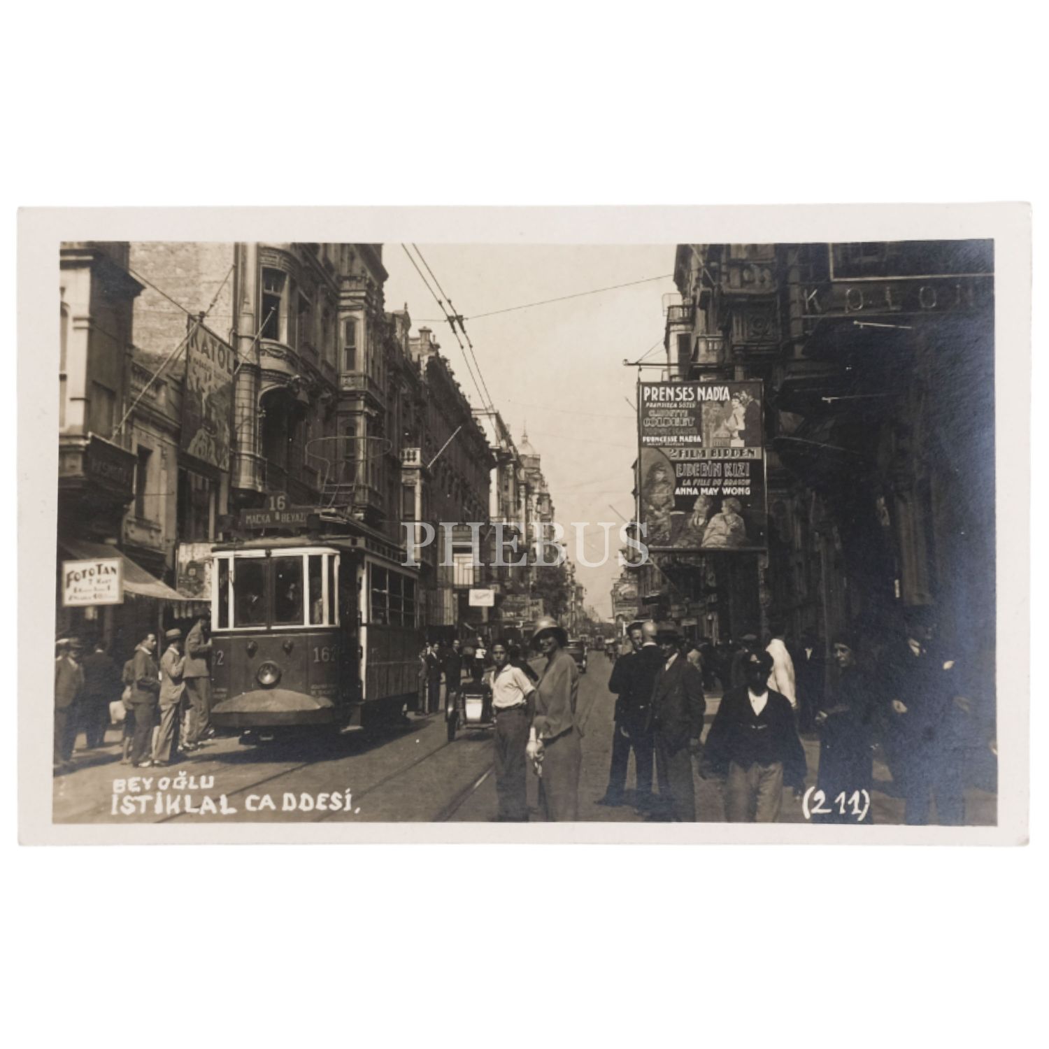 Sol tarafta "Foto Tan" tabelası ve "Maçka-Beyazıt" tramvayı; sağ tarafta "Prenses Maya" ve "Ejderin Kızı" filmlerinin Türkçe-Fransızca yazılı tanıtım tabelası görülmektedir.
