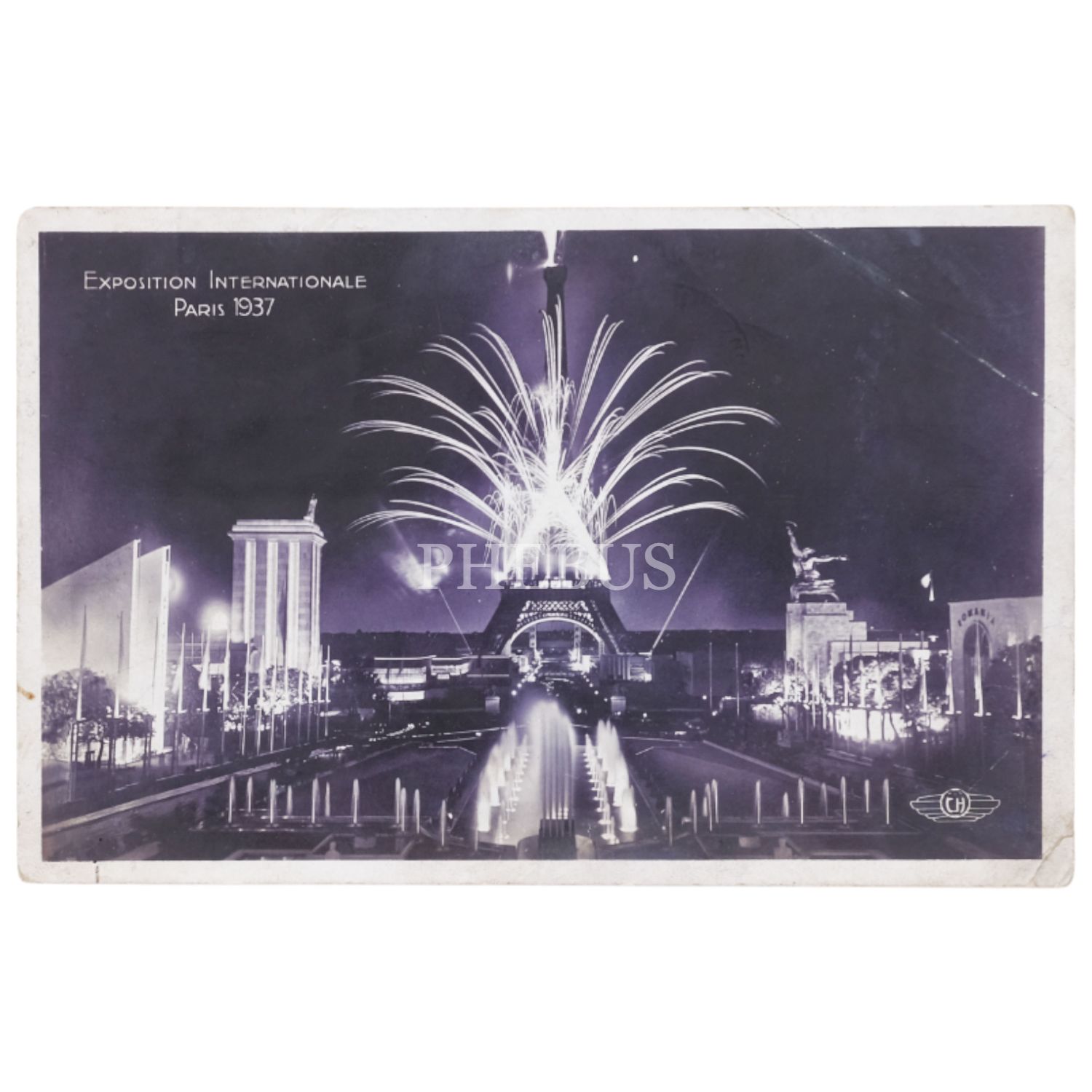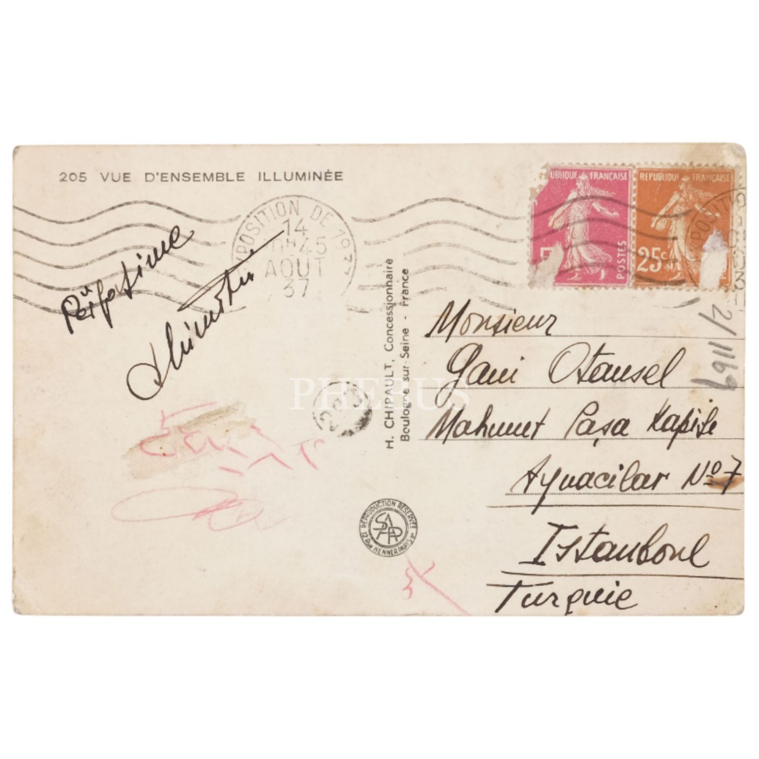 1937 Paris Uluslararası Sergisi görselli, İstanbul´a postalanmış kartpostal, "Exposition Internationale Paris 1937", 14x9 cm...