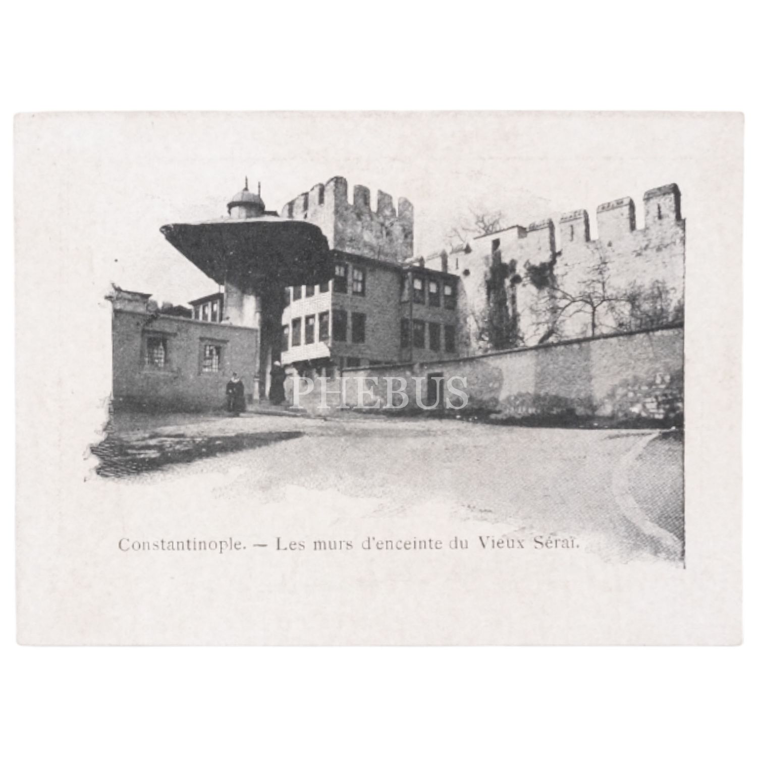 Sultanahmet, Ayasofya İmaret Kapısı ve Soğukçeşme Sokağı görselli, arka yüzü Fransızca mağaza (Lyon merkezli) reklamlı fotokart, "Constantinople - Les murs d´enceinte du Vieux Serai", 10,5x7,5 cm...