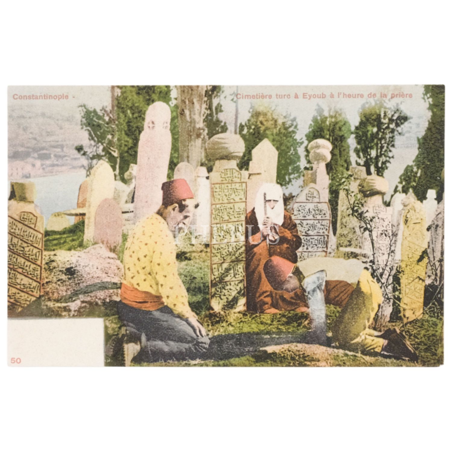 Eyüpsultan Mezarlığı´nda dua okuyanlar, "Constantinople - Cimetiere turc a Eyoub a l´heure de la priere", 14x9 cm...