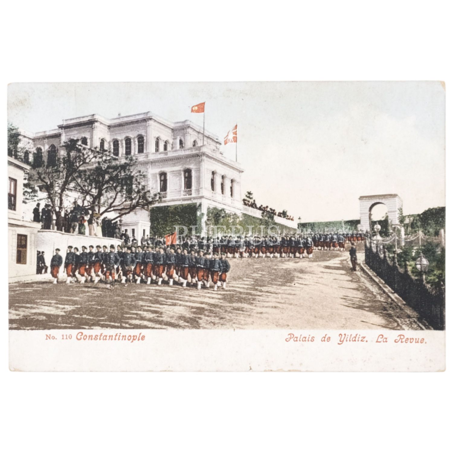 İstanbul´u ziyaret eden Alman İmparatoru Kayzer II. Wilhelm´in şerefine Yıldız Sarayı´nda tertip edilen görkemli geçit merasiminden bir görünüm, "Constantinople - Palais de Yildiz. La Revue", 14x9 cm...