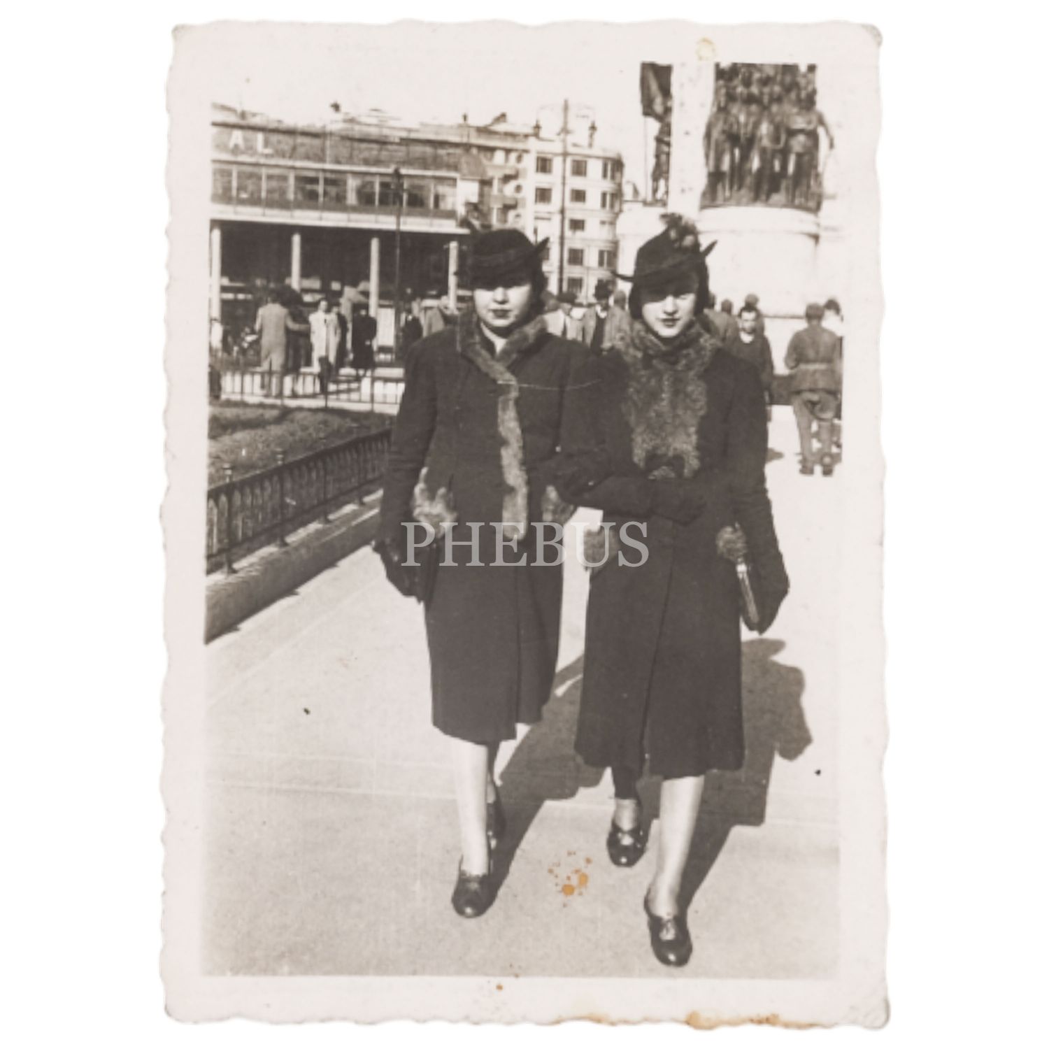 İki genç ve şık hanımefendinin, Taksim Cumhuriyet Anıtı önünde aldırdığı alaminüt fotoğraf, arka yüzü "Foto Sait Film / Taksim, İstanbul" damgalı, 6,5x8,5 cm...