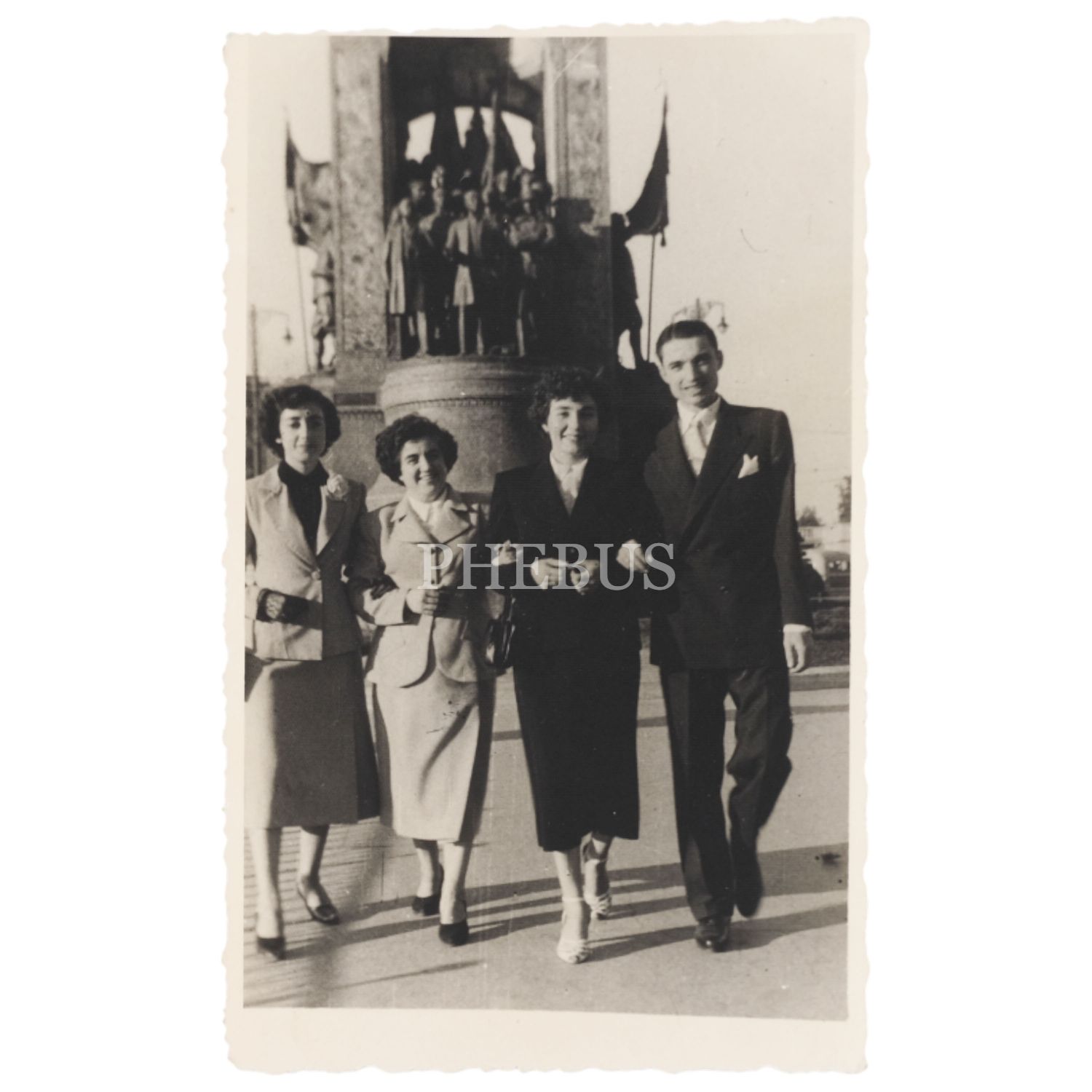 Dört arkadaşın Taksim Cumhuriyet Anıtı önünde kol kola poz vererek aldırdığı alaminüt fotoğraf, 19 Eylül 1953, 9x14 cm...