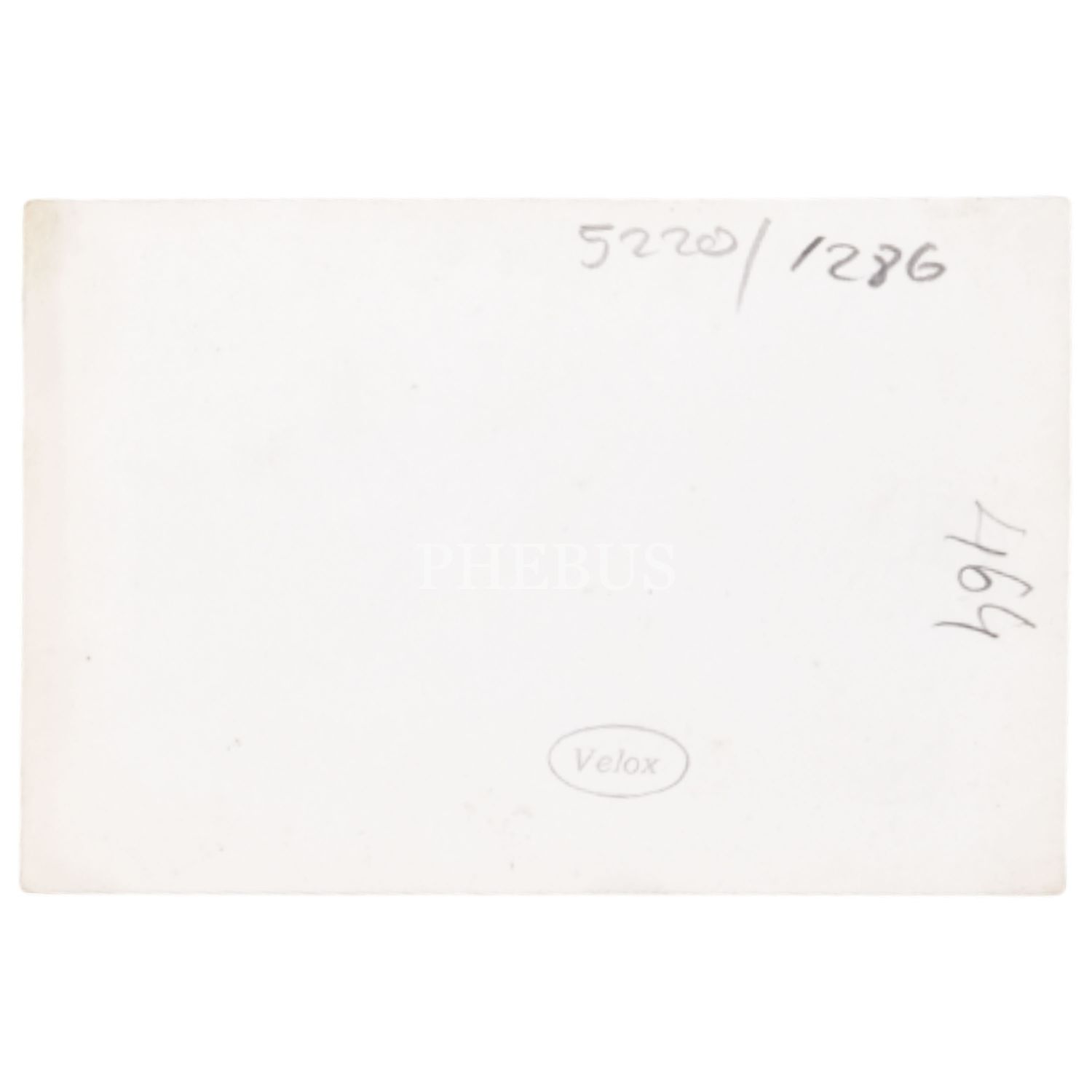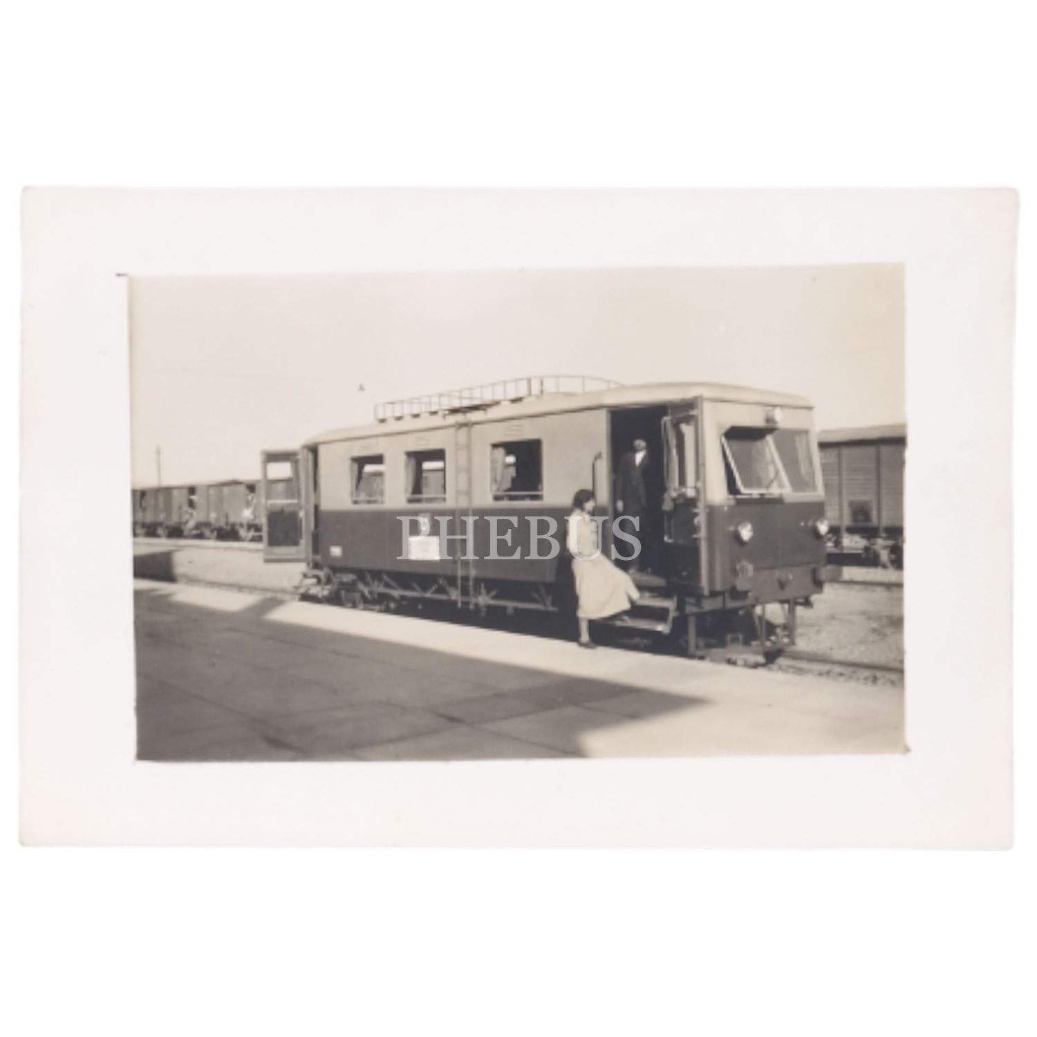 Bir lokomotifin önünde poz veren kadın, 9,5x6,5 cm...