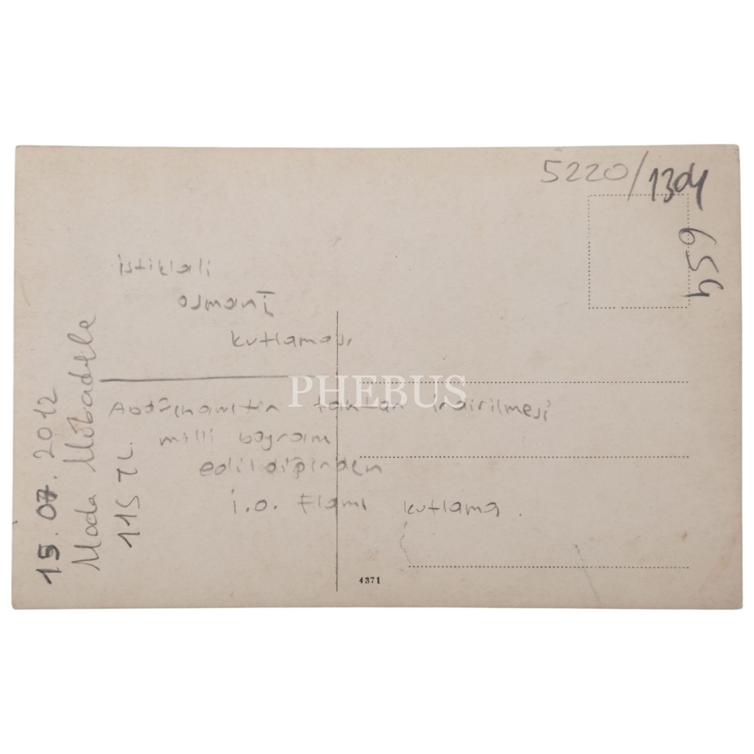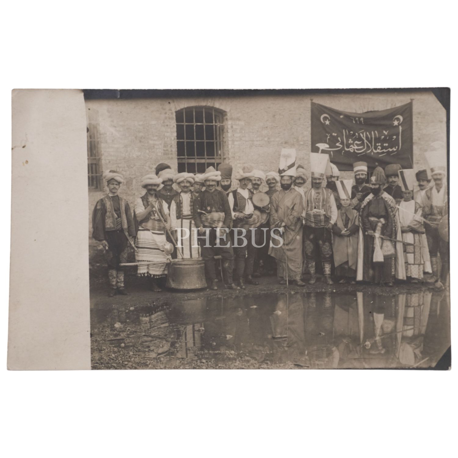 Bir anma merasimi sırasında "İstiklal-i Osmani" yazılı pankart önünde, kostümleriyle kamera karşısına geçen müsamere ekibi, 14x9 cm...