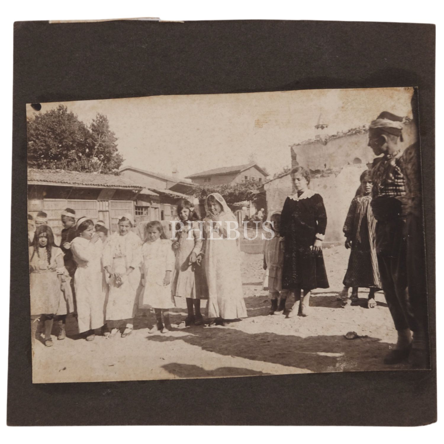 Osmanlı döneminden, kara önlüklü bir kız öğrenci ve çocukların fotoğrafı, 12x8 cm...