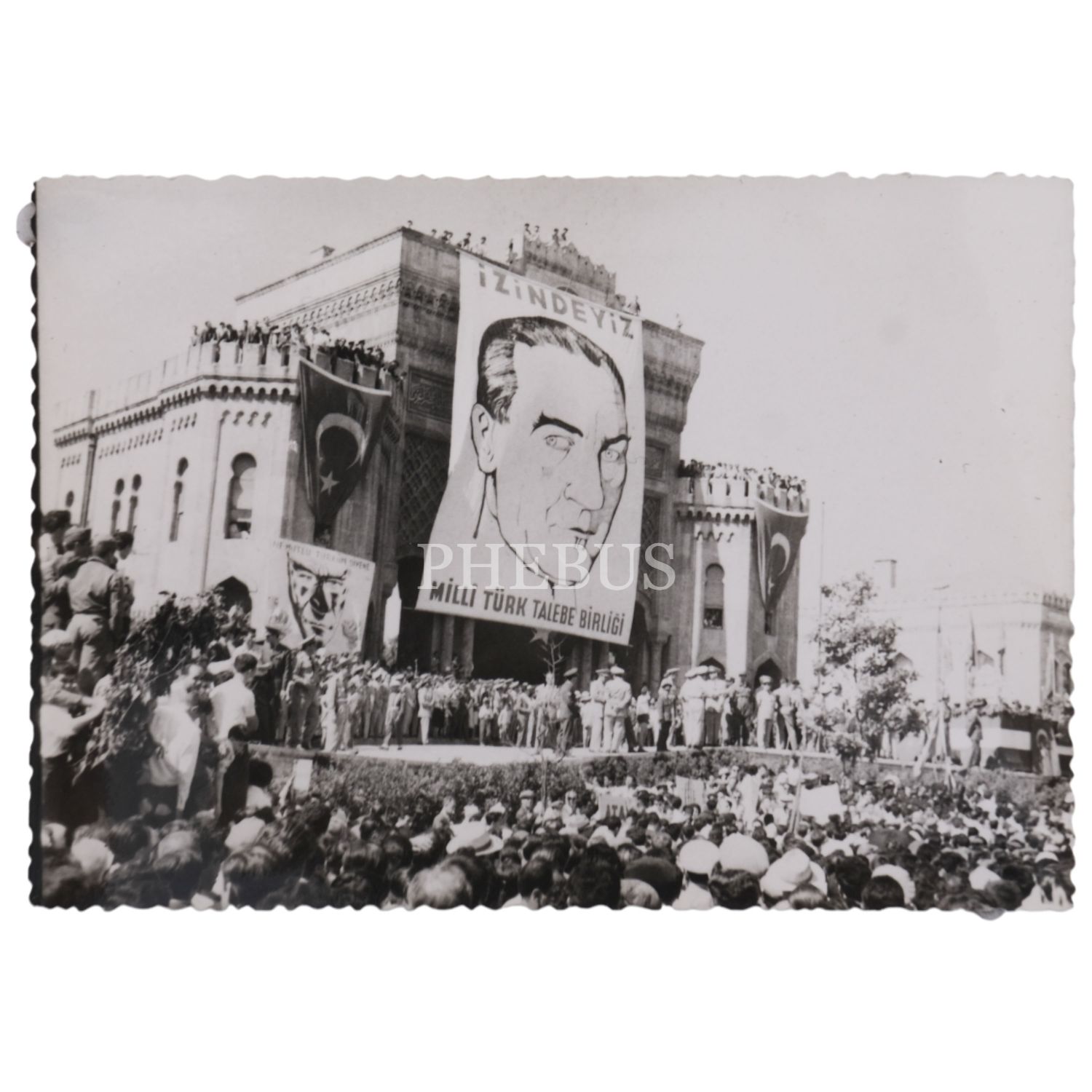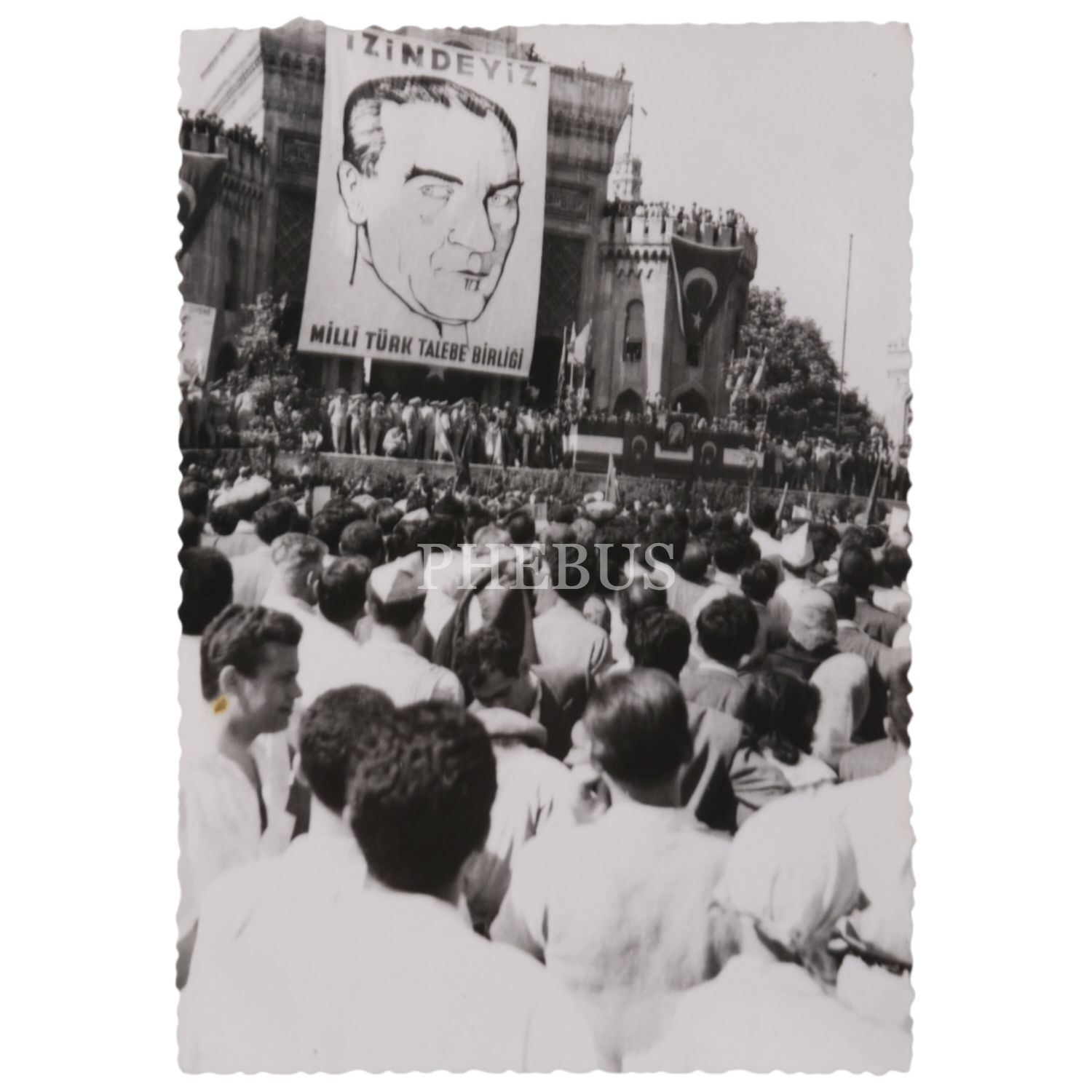 Milli Türk Talebe Birliği´nin düzenlediği bir gösteride çekilmiş, İstanbul Üniversitesi Kapısı üzerine "Atam İzindeyiz" yazılı Mustafa Kemal Atatürk portresinin resmedildiği pankartın görüldüğü fotoğraf, 11x8 cm...