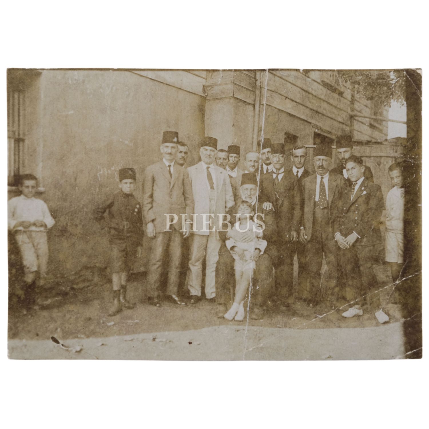 Osmanlı döneminden, bir grup fesli beyefendi ve çocukların hatıra fotoğrafı, 11x8 cm...