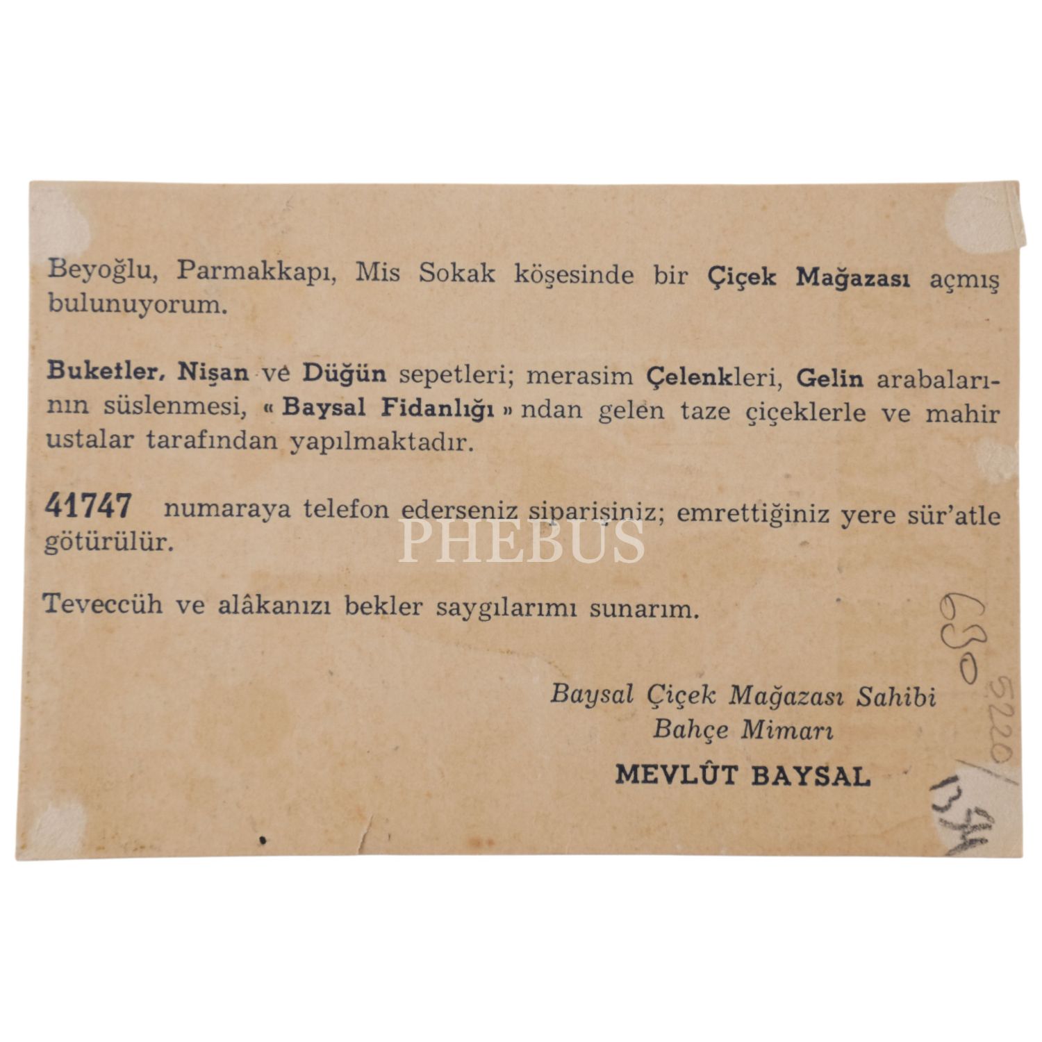 Baysal Çiçek Mağazası reklamlı kart, 9x13 cm...