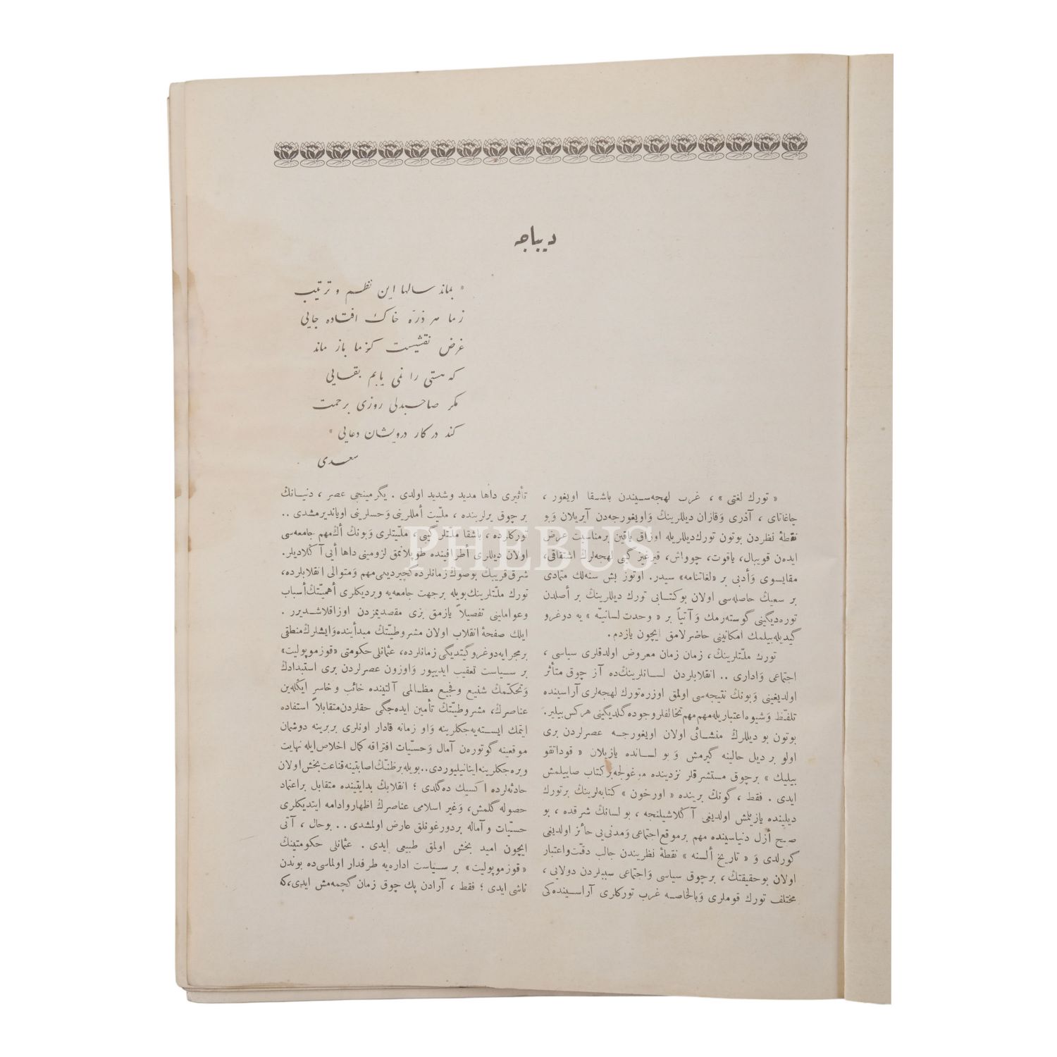 *Sayfalar iyi kondisyondadır ancak son kısımdaki formalar kitabın geri kalanından ayrılmıştır. Baştaki ıslaklık lekesini görmek için fotoğrafları inceleyiniz. Bu iz azalarak birkaç formaya sirayet etmiştir.
