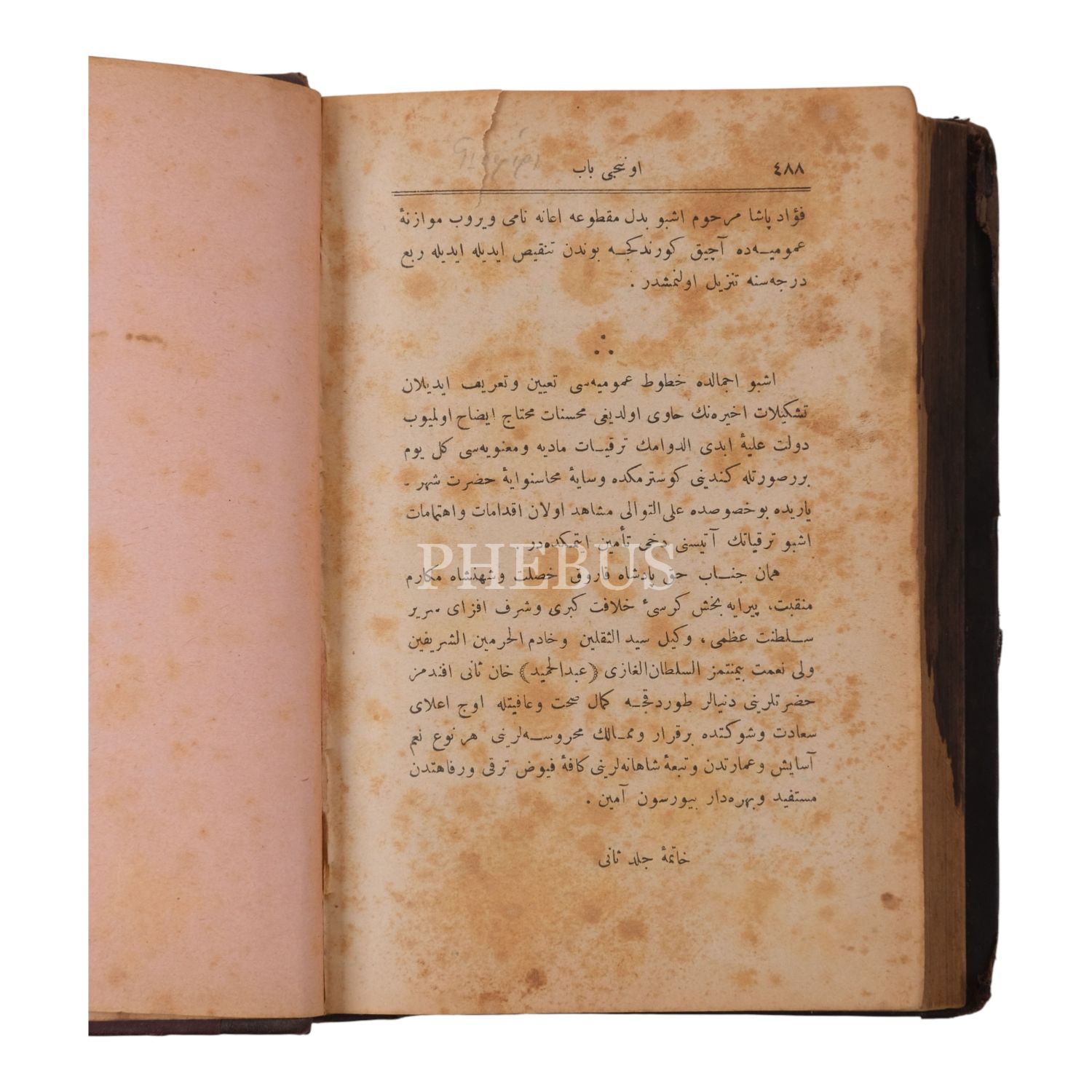 *Son sayfanın üst kısmında ilk satıra ulaşan bir yırtık vardır. Toplam kitabın yaklaşık üçte birlik kısmında sayfa uçlarında siyah bir sıvı lekesi vardır. Örnek olarak künye sayfasını inceleyerek pey veriniz.
