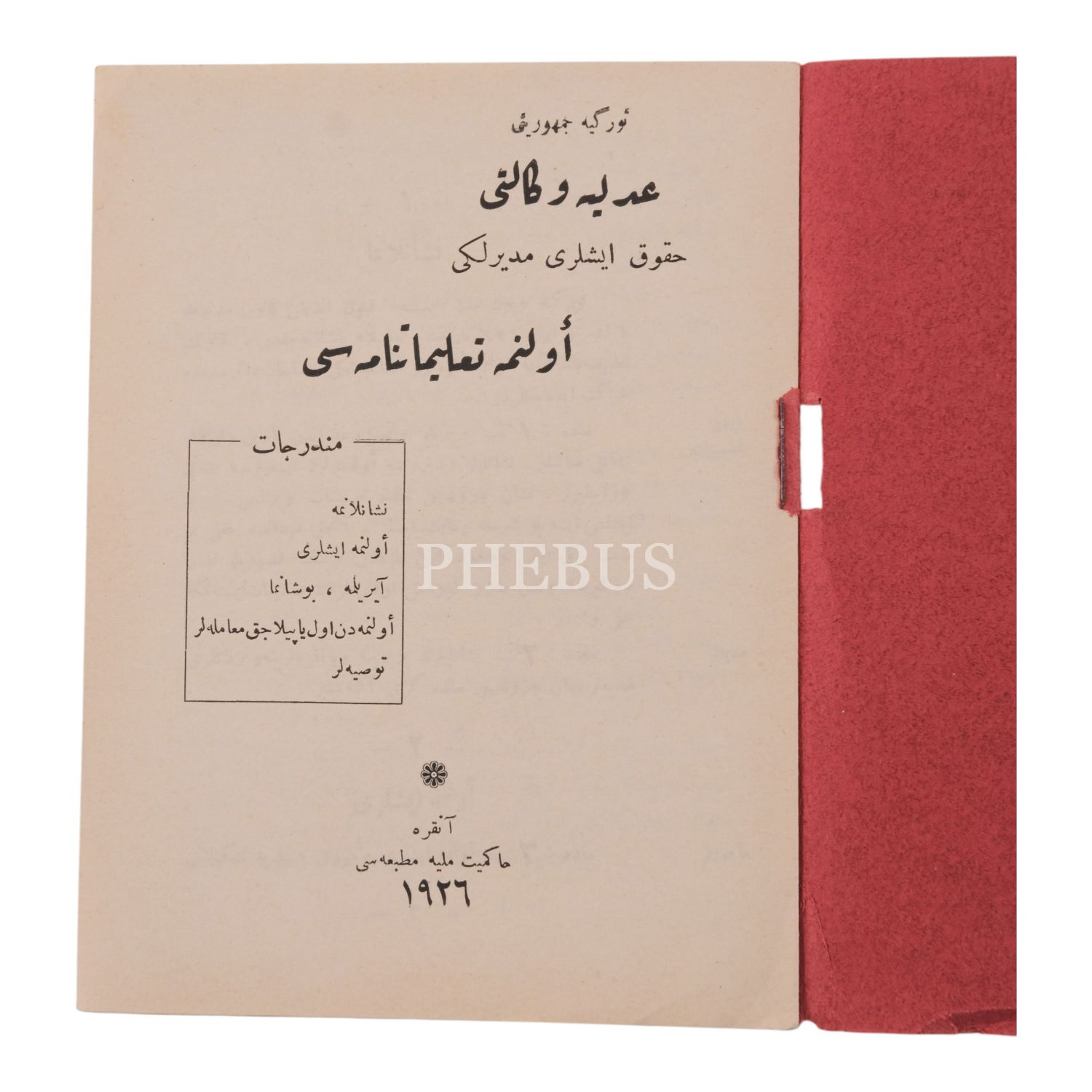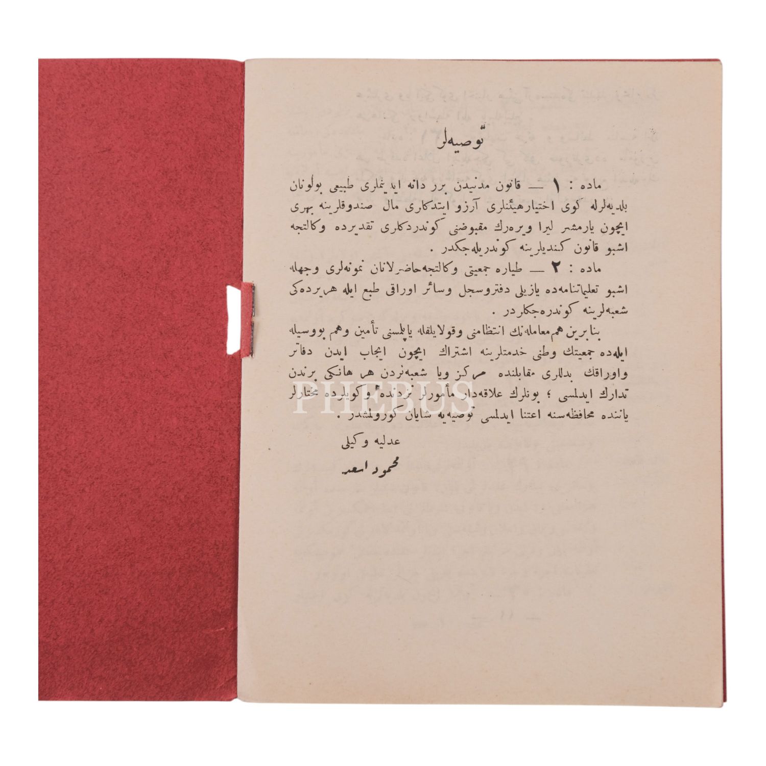Geliri Tayyâre Cemiyeti´ne bağışlanan, Adliye Vekaleti tarafından basılan kitapçık.